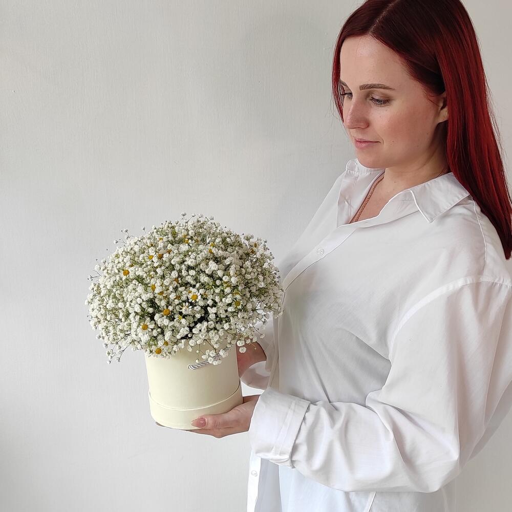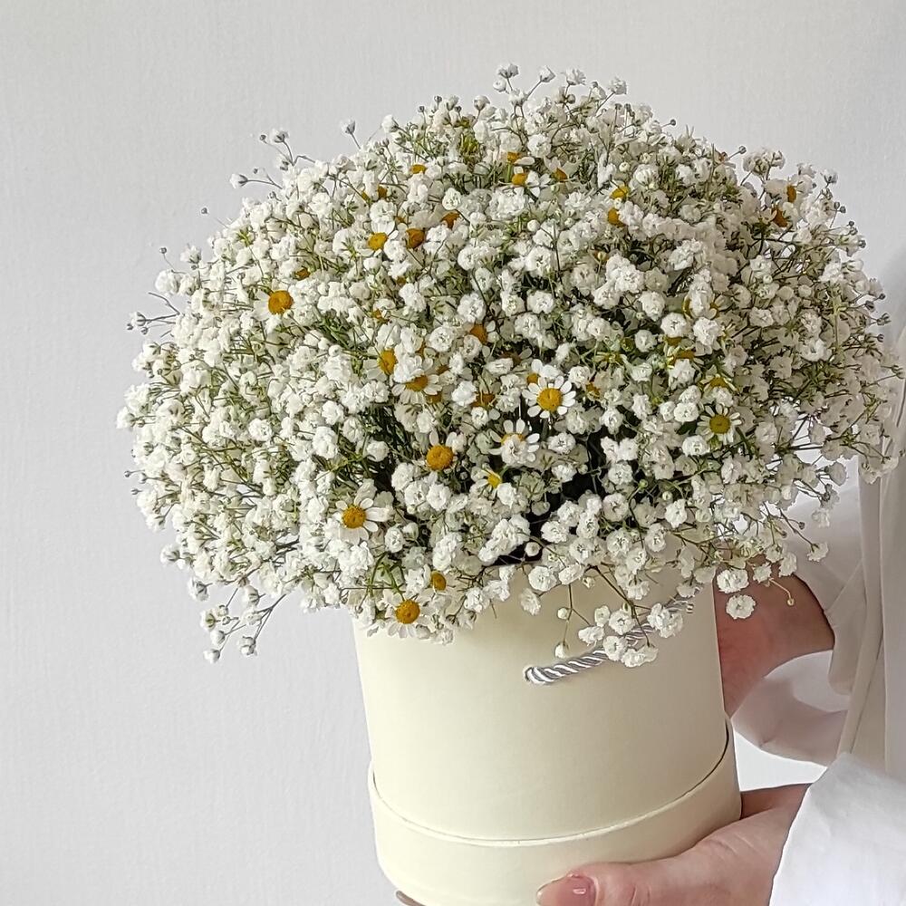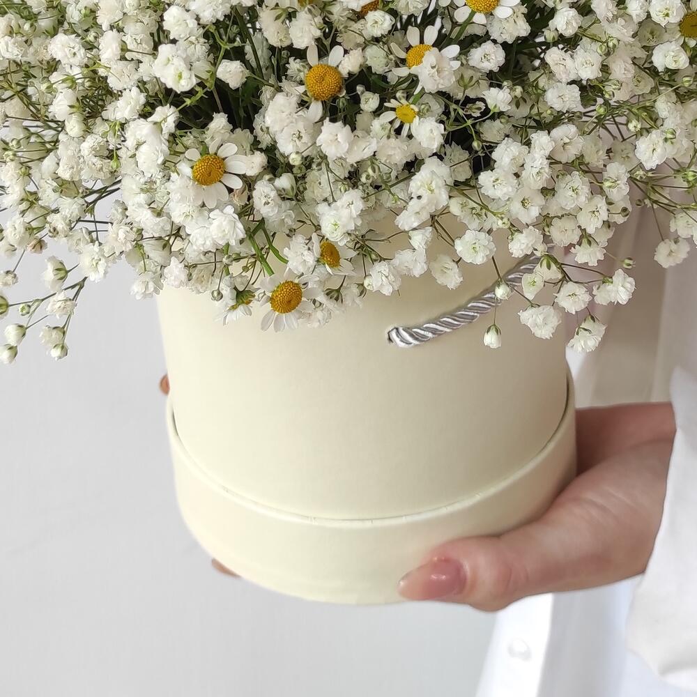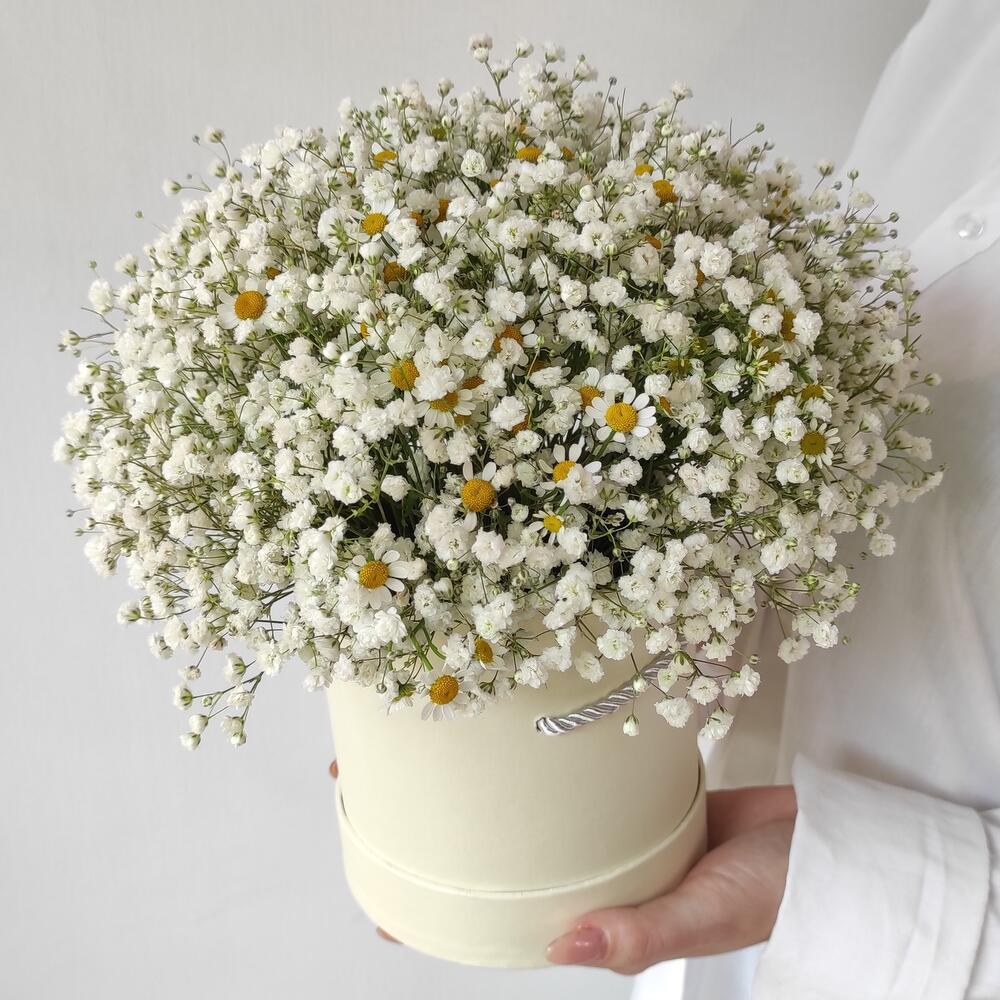 Композиция в шляпной коробки из гипсофилы и ромашки обладает чудесным ароматом поля и летних вечеровСтильная композиция в флористической губке, это очень эффектно и удобно одновременно , не требует смены воды и дополнительной вазы для цветов Наша рекомендация для того ,чтобы цветы дольше вас радовали доливайте 1/2 стакана воды 1 раз в 2-3 дня Цветы гипсофилы отличаются своей стойкостью и способностью высыхать в первозданном виде , такая композиция ещё долго будет радовать вас в качестве сухоцвета Мы подпишем от вас открытку 💌 бесплатно