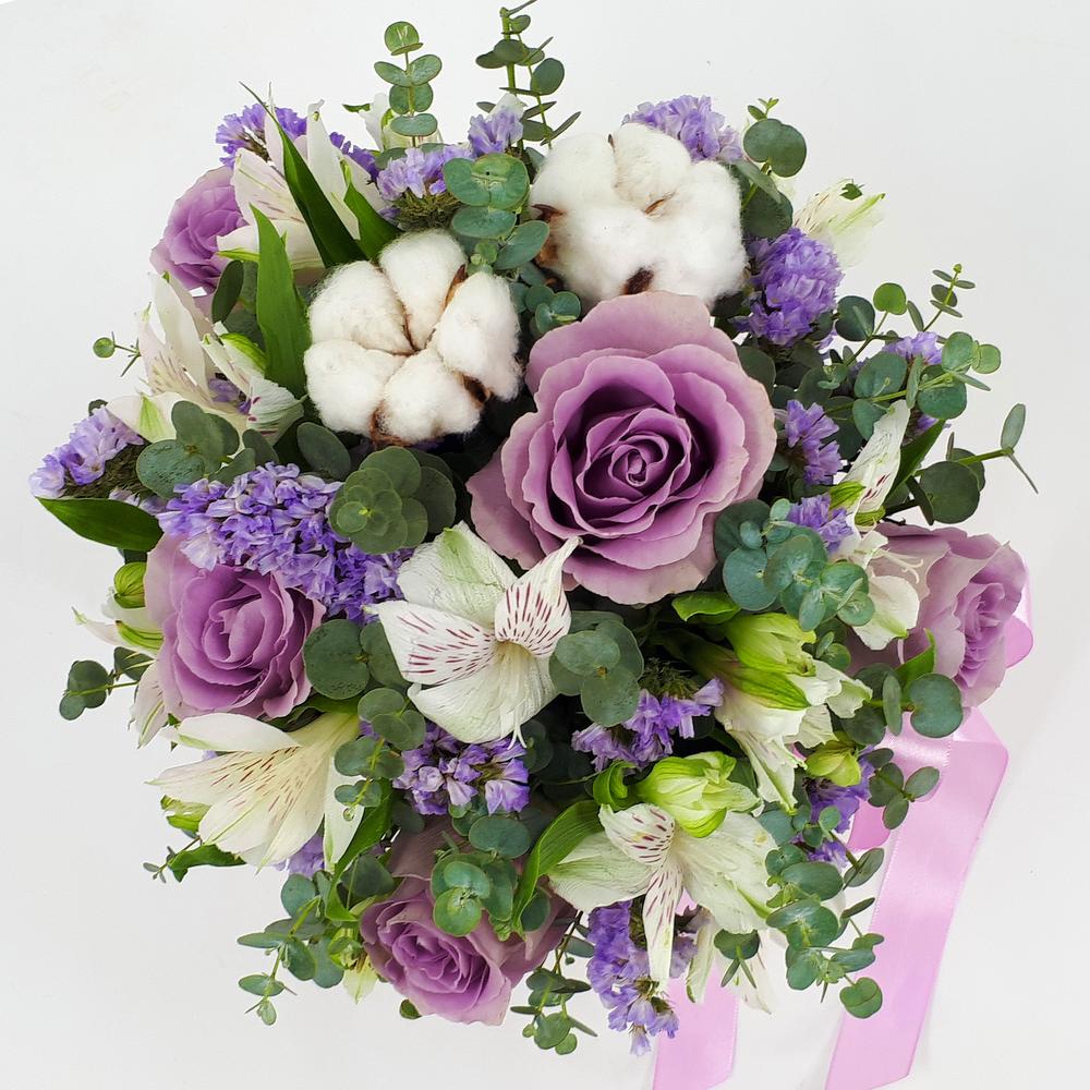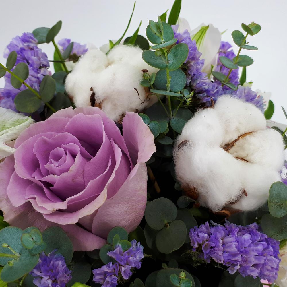 Нежная композиция в сиреневых тонах. Составлена из роз, хлопка, альстромерий, статицы и эвкалипта.