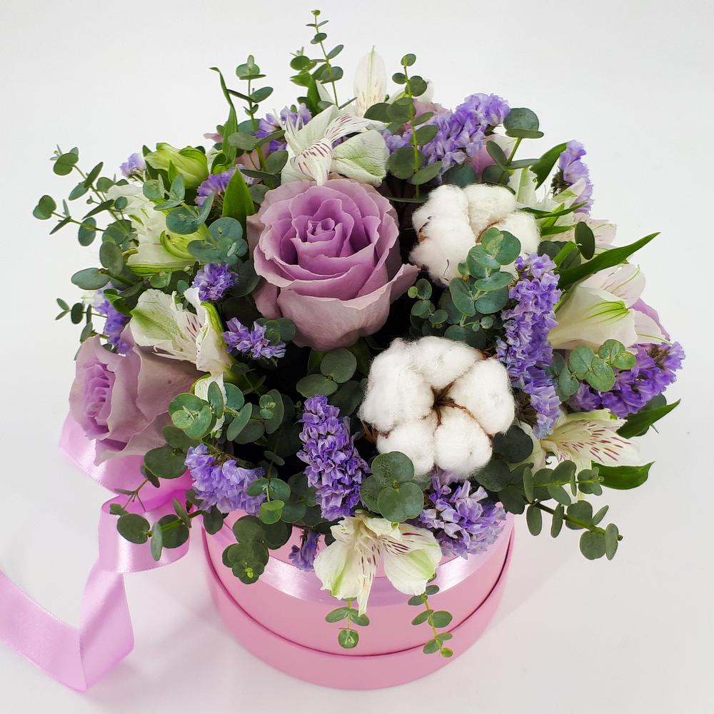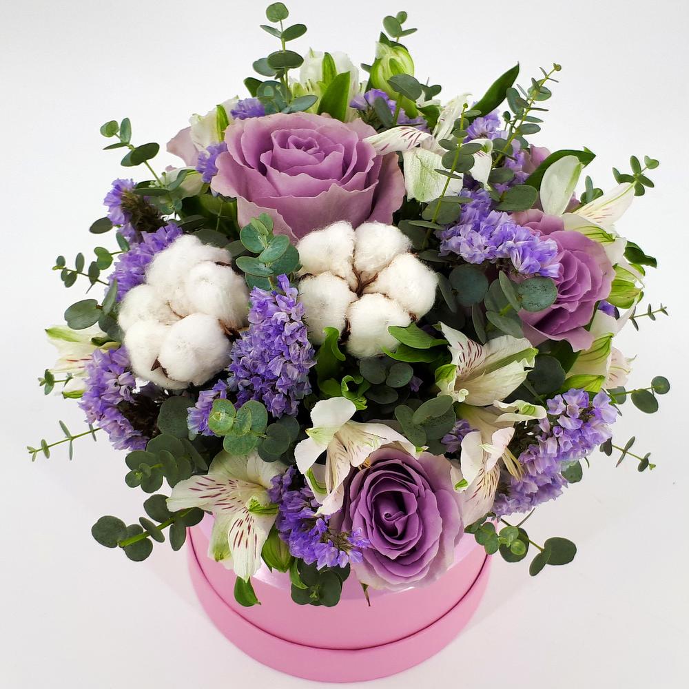 Альстромерия - 2 шт. Пиафлор (оазис) - 1 шт. Эвкалипт - 3 шт. Роза одноголовая - 5 шт. Лента атласная - 1 шт. Коробка шляпная - 1 шт. Хлопок соцветие - 2 шт. Статица сиреневая - 2 шт.
