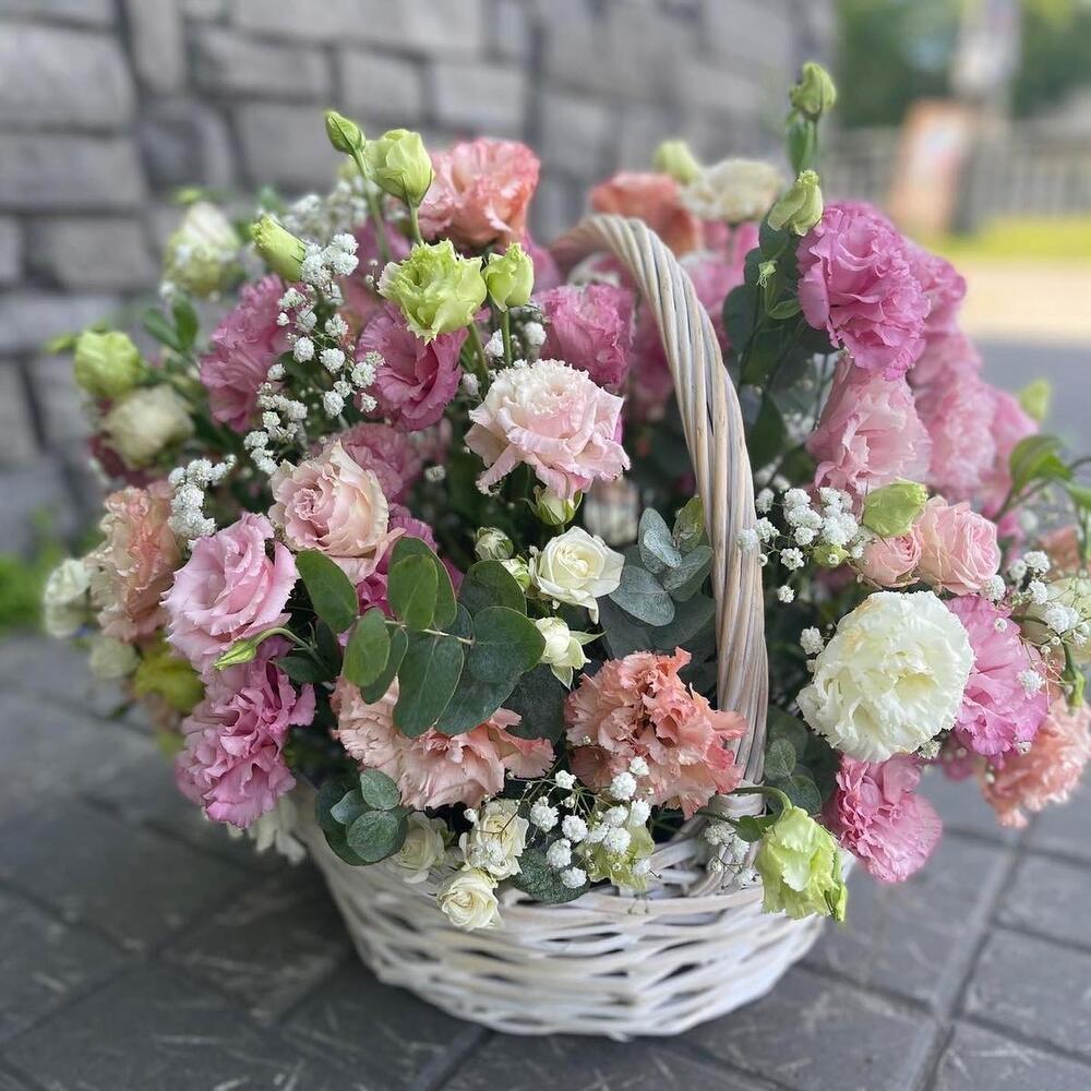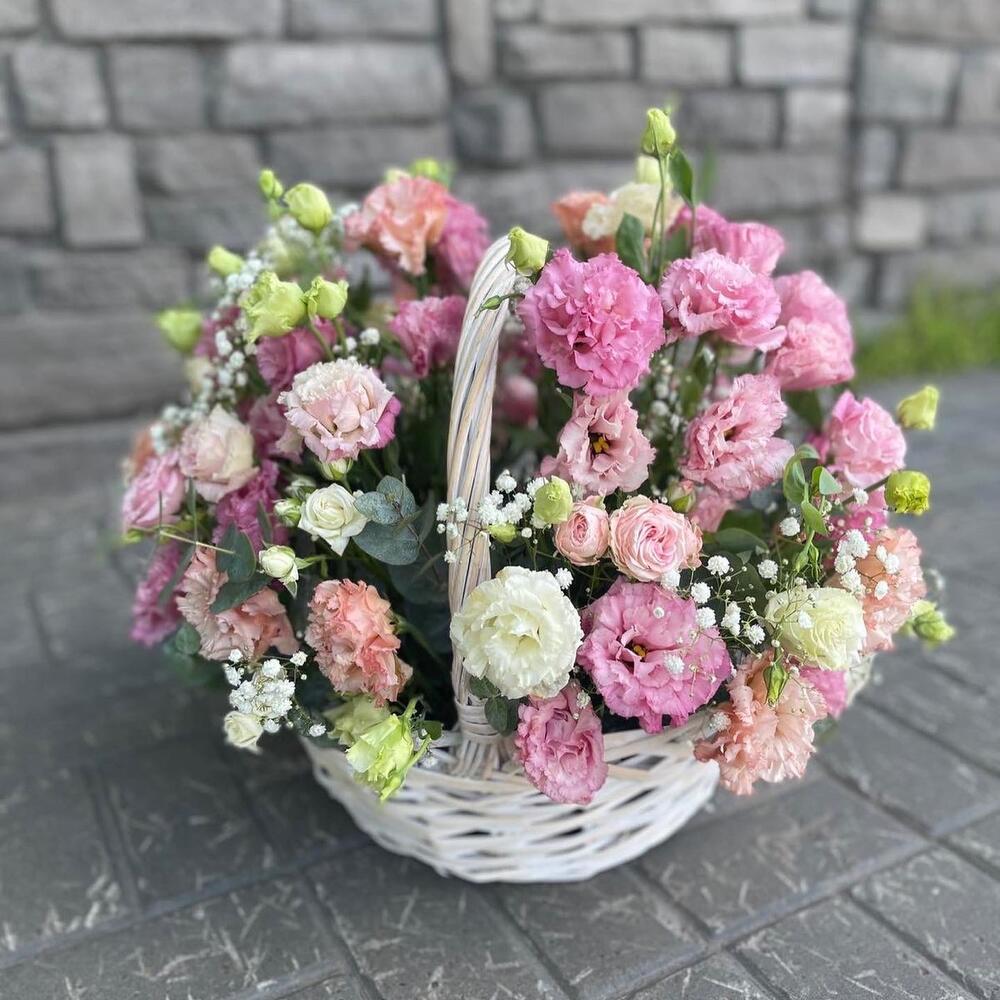 Лизиантус – 11 шт. Эвкалипт – 7 шт. Корзина плетеная – 1 шт.