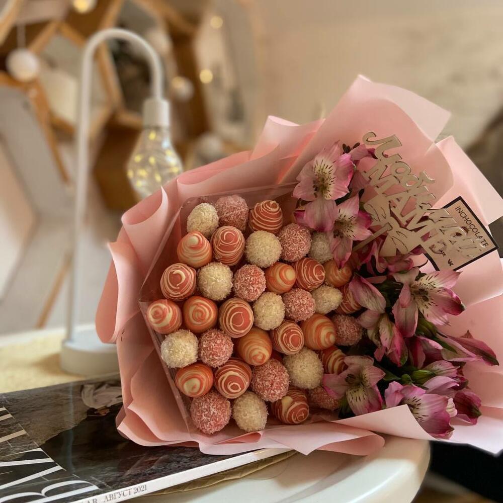 Лента – 1 шт. Упаковка – 1 шт. Альстромерия розовая – 3 шт. Клубника в шоколаде – 300 гр.