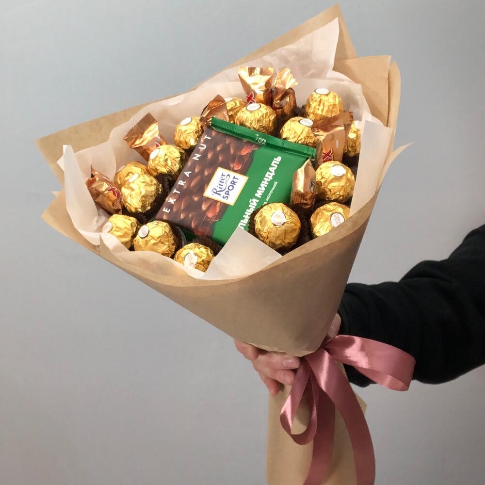 ферреро роше - 16 шт. Крафт упаковка - 4 шт. Риттер спорт мини - 3 шт. Твикс мини - 7 шт.