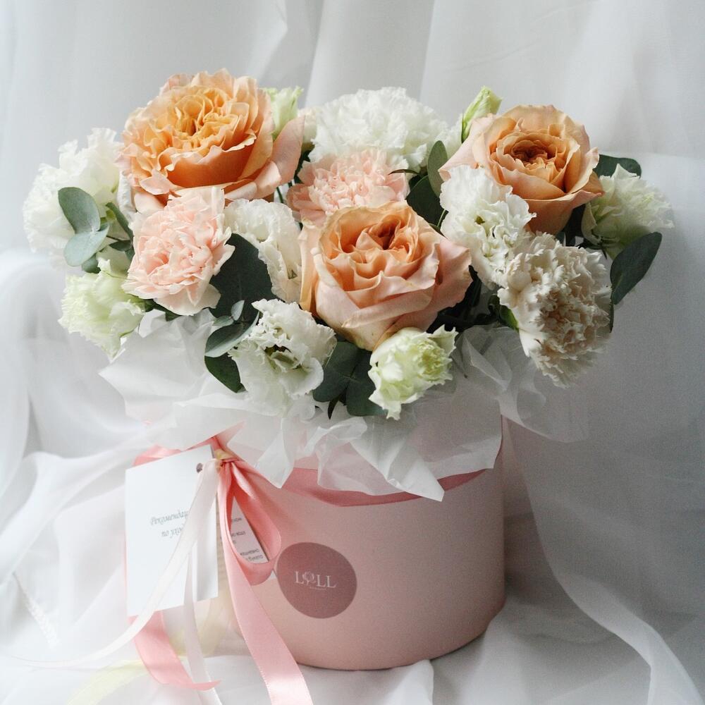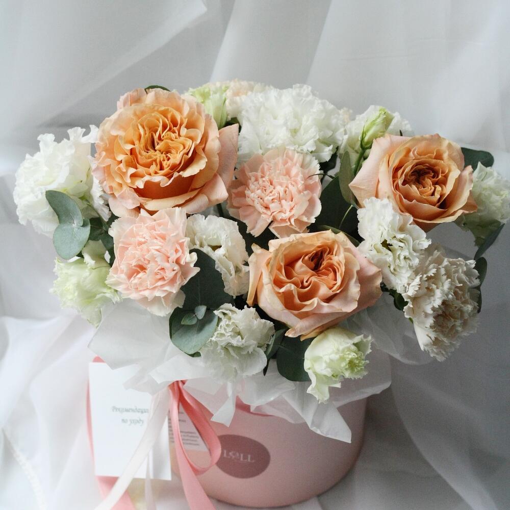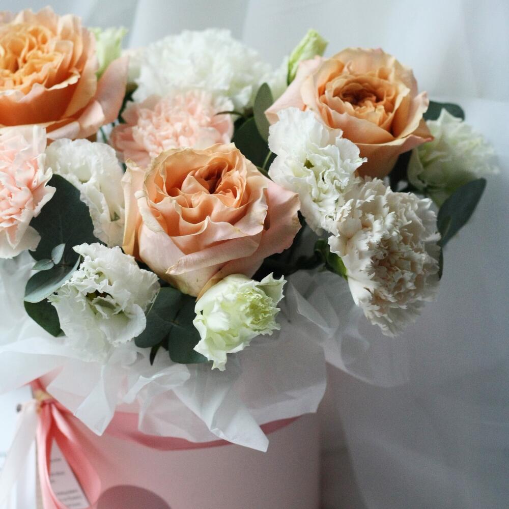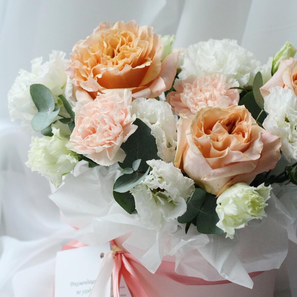 Эвкалипт – 2 шт. Гвоздика – 6 шт. Роза пионовидная – 3 шт. Пена флористическая – 1 шт. Бокс – 1 шт. эустома белая – 2 шт.