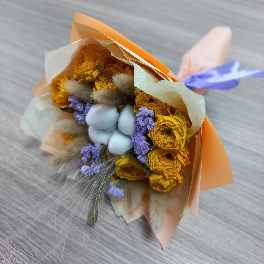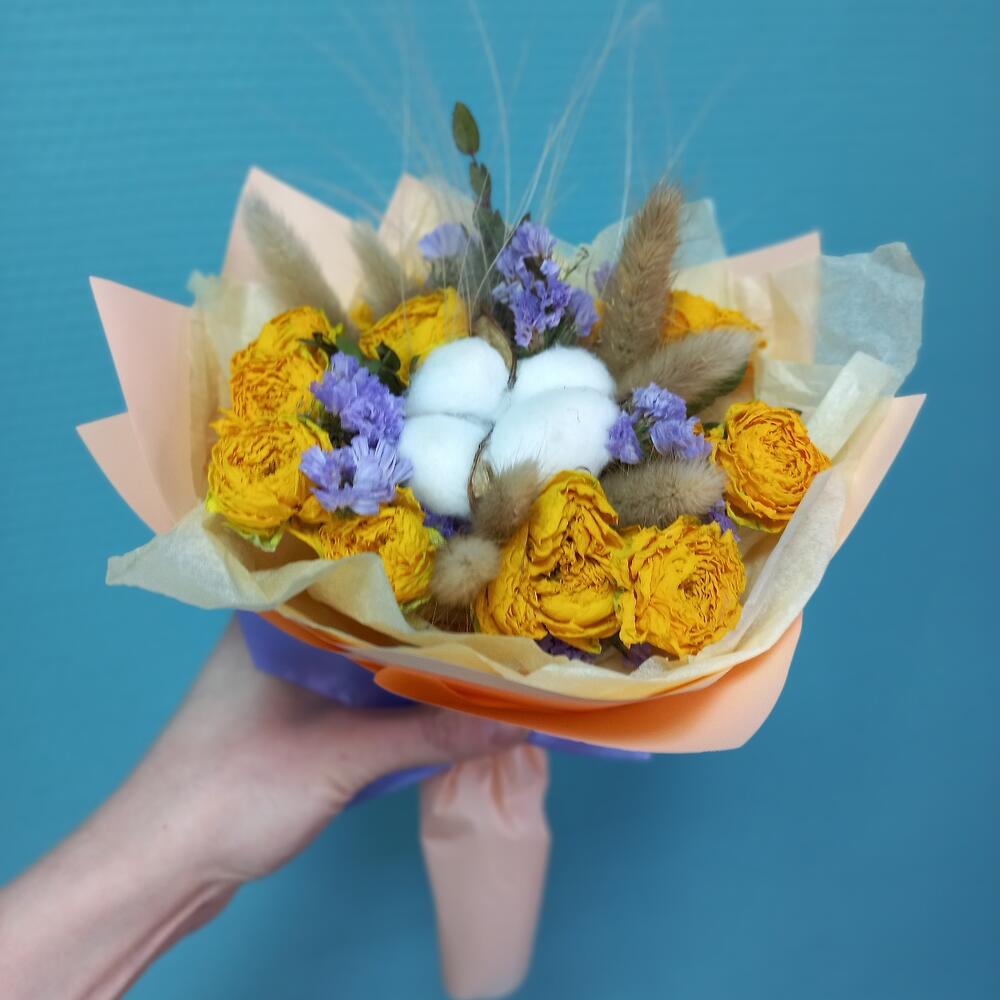 Хлопок – 1 шт. Лента атласная – 1 шт. Упаковка дизайнерская – 2 шт. Лагурус – 7 шт. Стифа – 1 шт. Роза кустовая сухоцвет – 3 шт. статица сухоцвет – 1 шт.