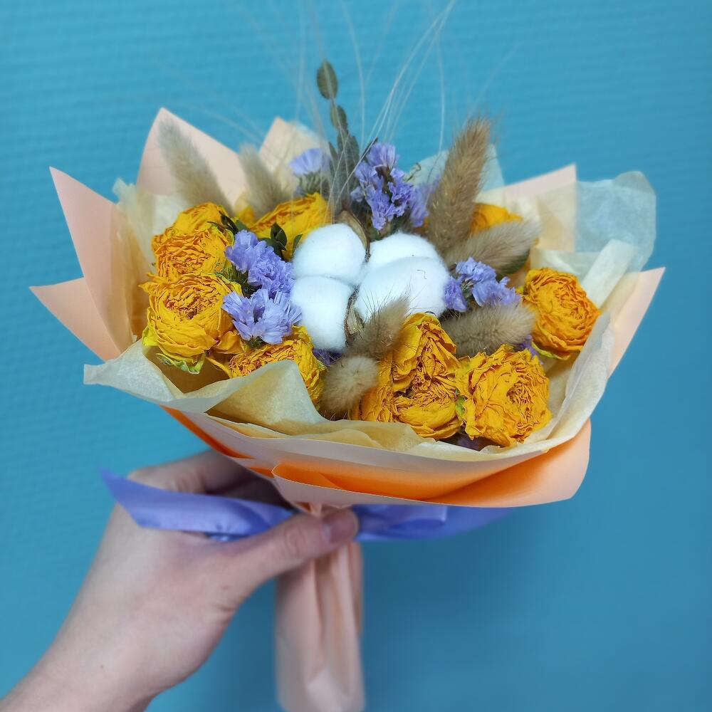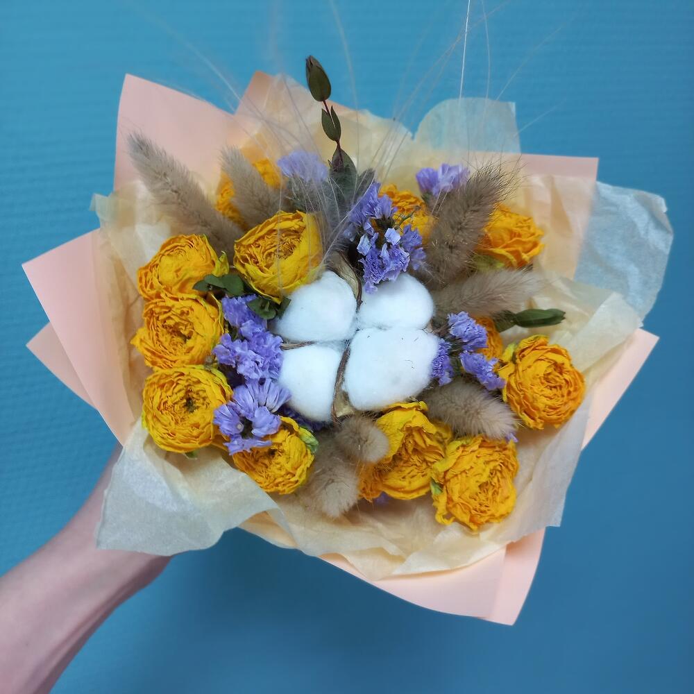 Хлопок - 1 шт. Лента атласная - 1 шт. Упаковка дизайнерская - 2 шт. Лагурус - 7 шт. Стифа - 1 шт. Роза кустовая сухоцвет - 3 шт. статица сухоцвет - 1 шт.