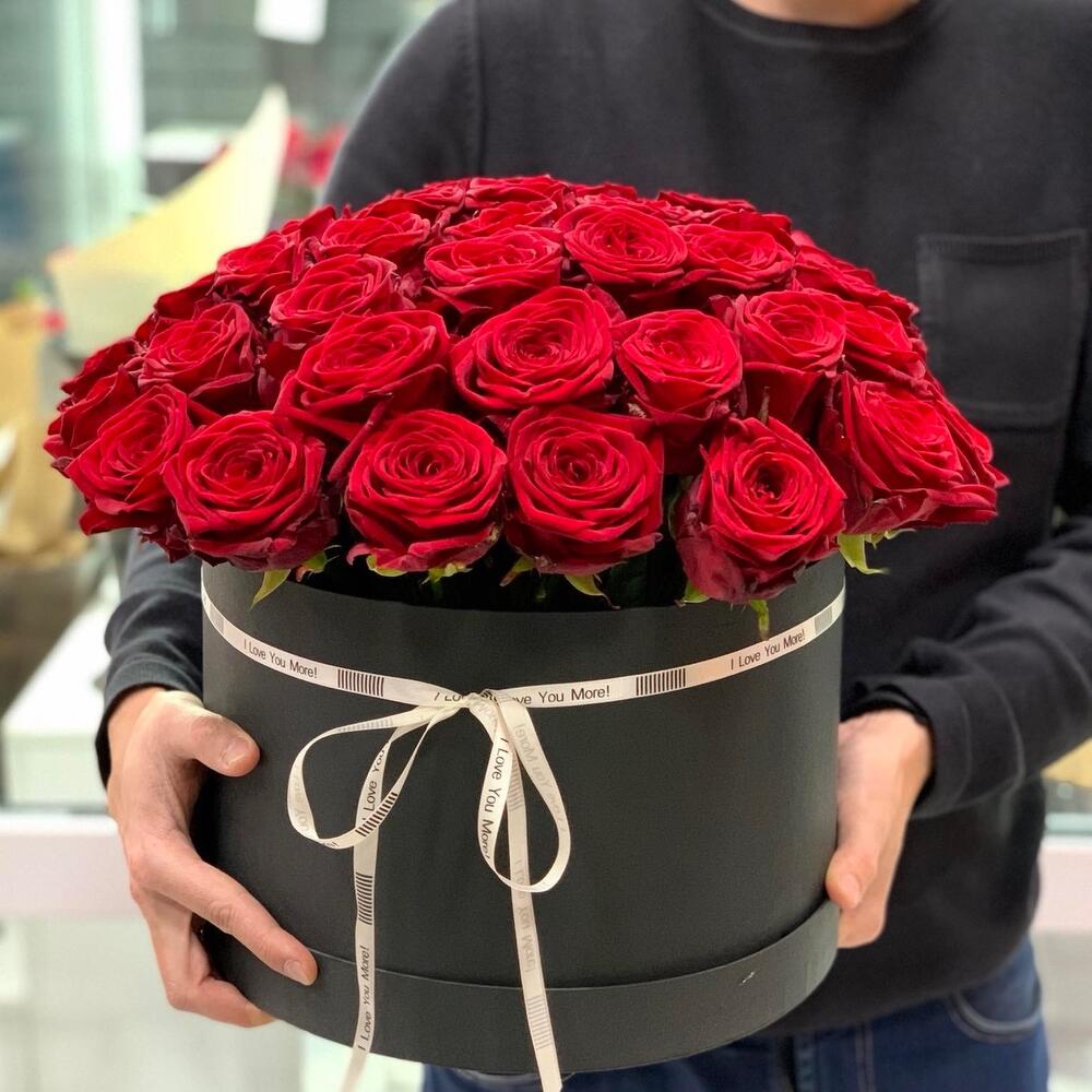 Роза Россия – 51 шт. Шляпная коробка с лентами – 1 шт. Оазис флористический – 3 шт.