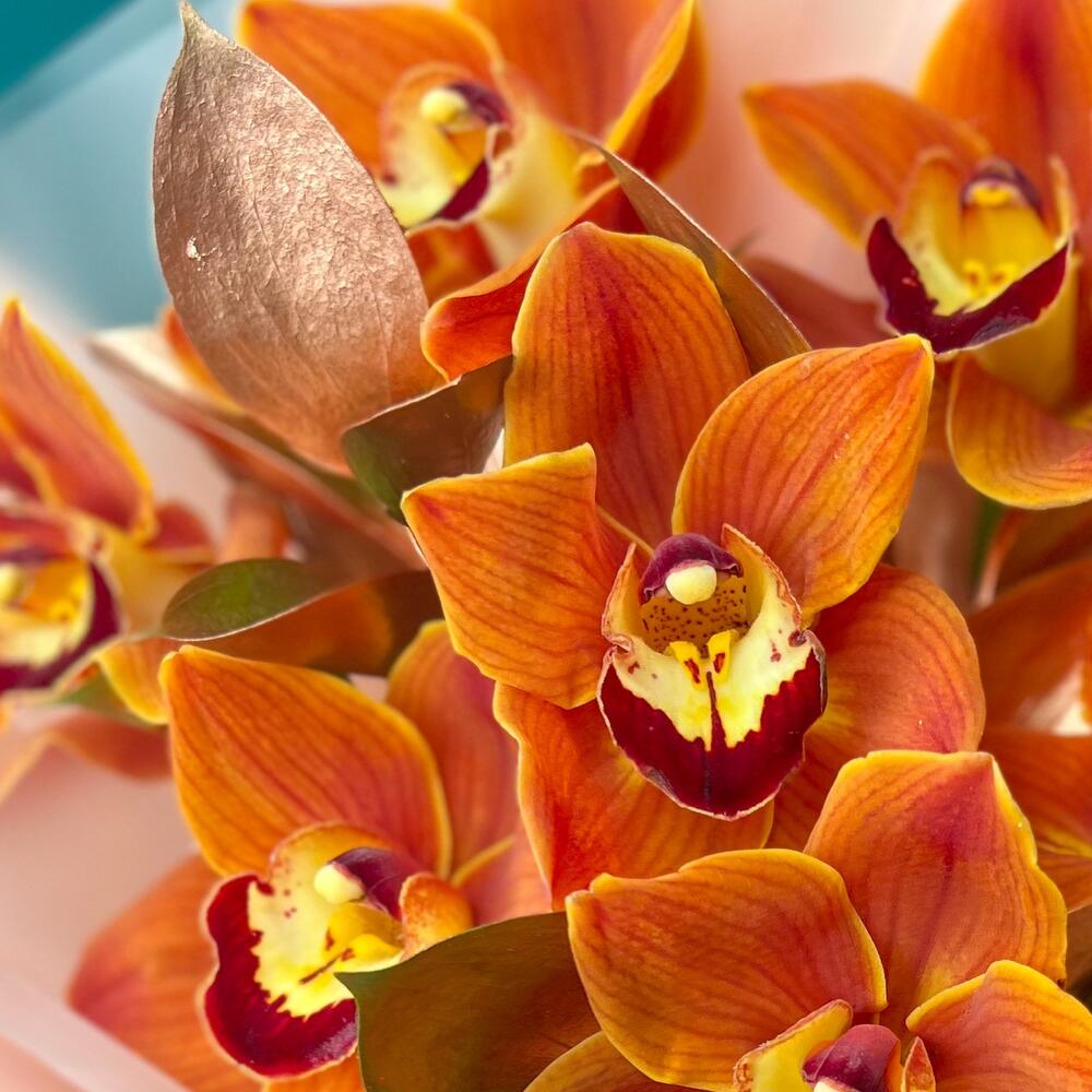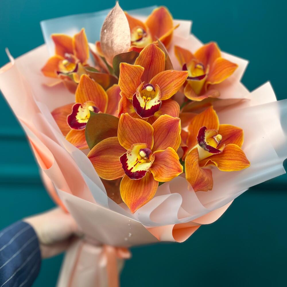 Рускус – 2 шт. Лента атласная – 2 шт. ЦИМБИДИУМ – 7 шт. Упаковка дизайнерская – 2 шт.