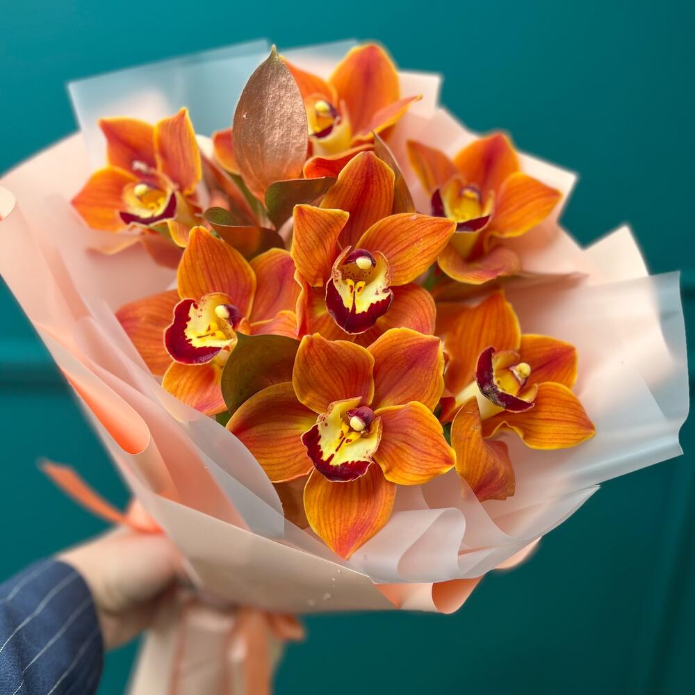 Рускус - 2 шт. Лента атласная - 2 шт. ЦИМБИДИУМ - 7 шт. Упаковка дизайнерская - 2 шт.