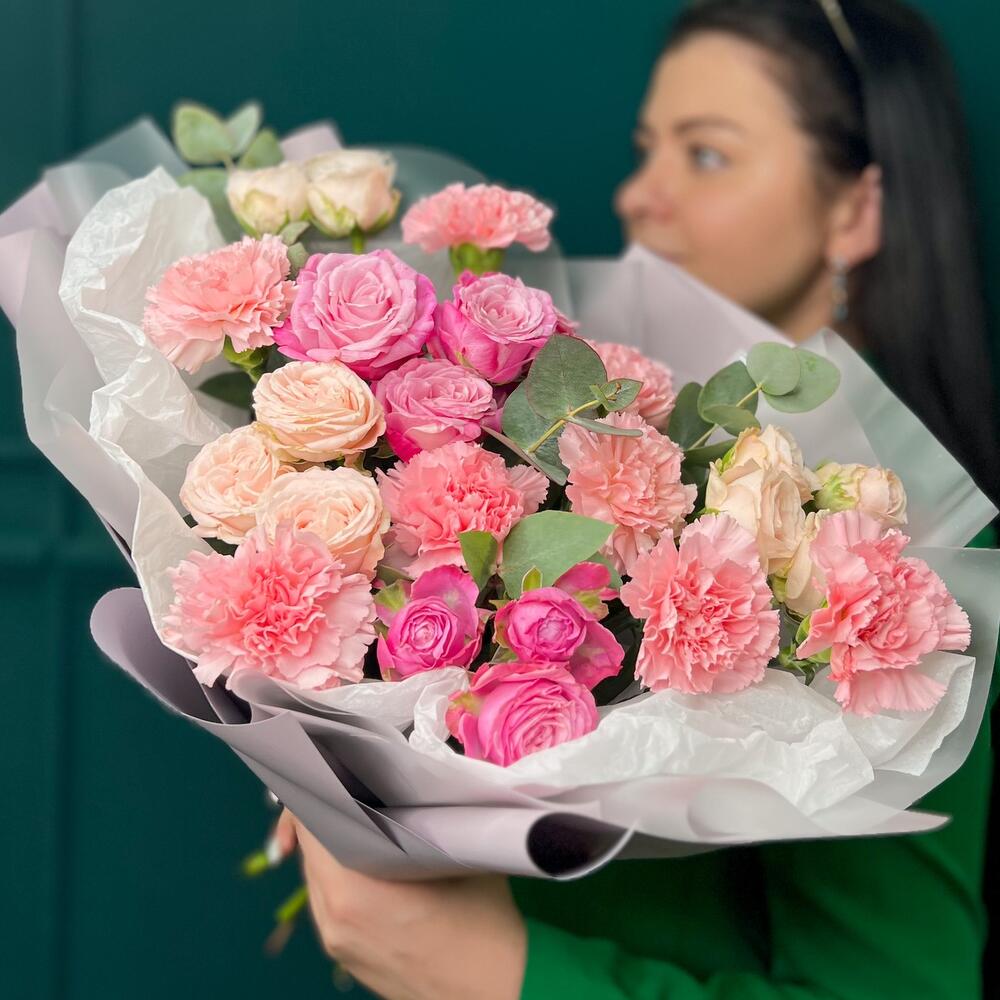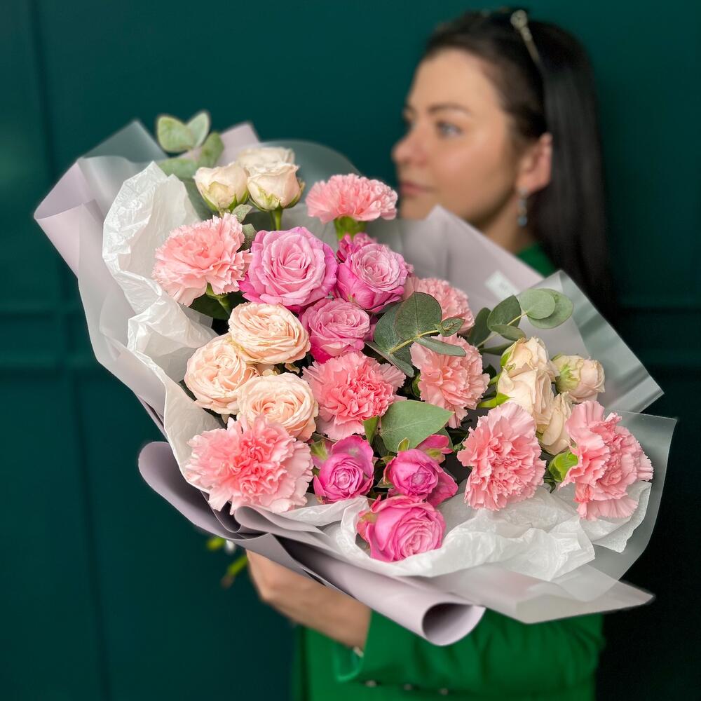 Эвкалипт - 5 шт. Лента атласная - 2 шт. Тишью - 2 шт. Диантус - 8 шт. Роза кустовая пионовидная - 5 шт. Упаковка дизайнерская - 2 шт.