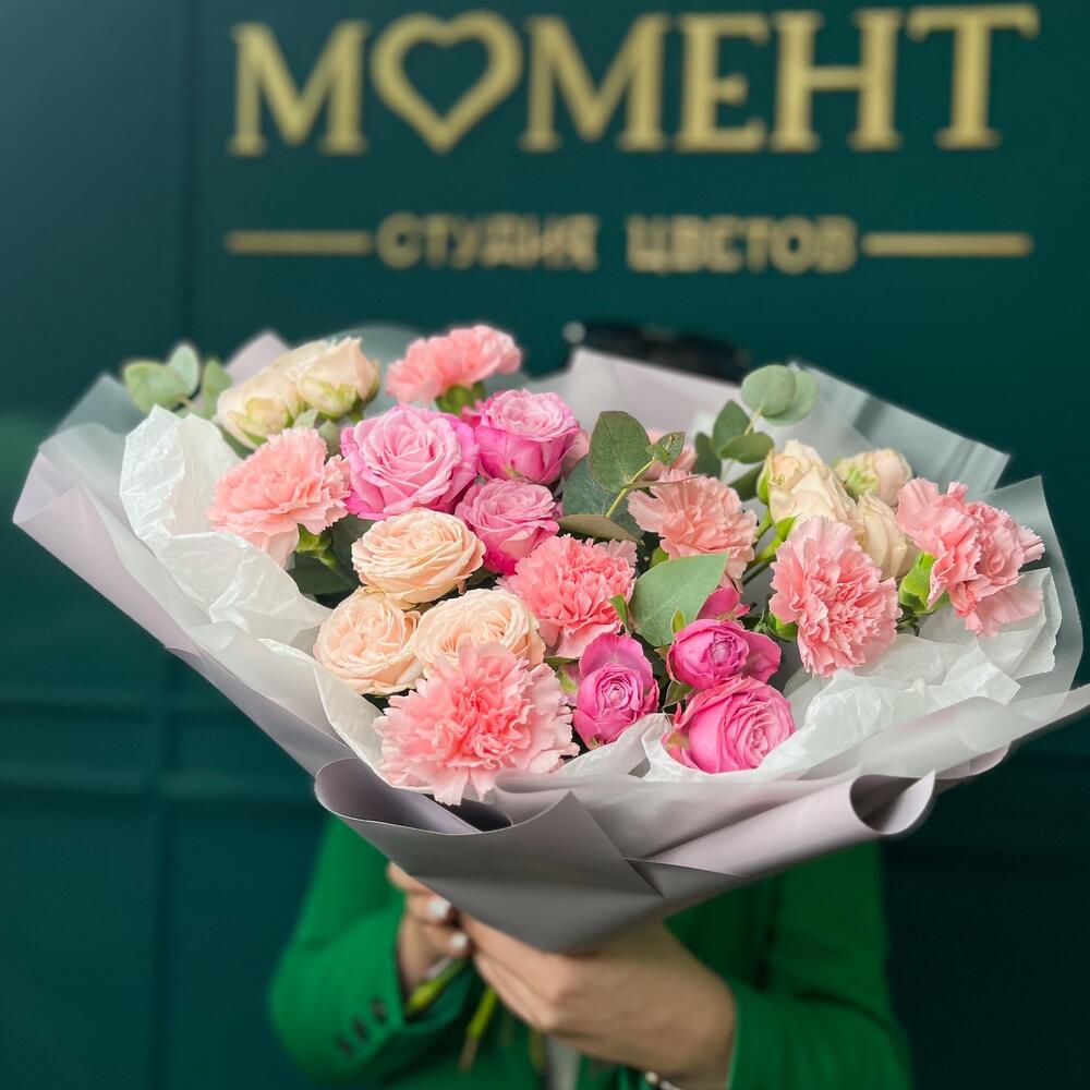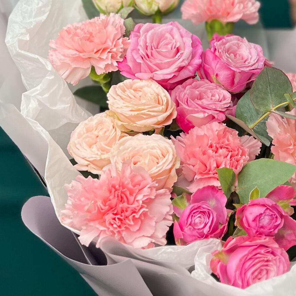 Эвкалипт – 5 шт. Лента атласная – 2 шт. Тишью – 2 шт. Диантус – 8 шт. Роза кустовая пионовидная – 5 шт. Упаковка дизайнерская – 2 шт.