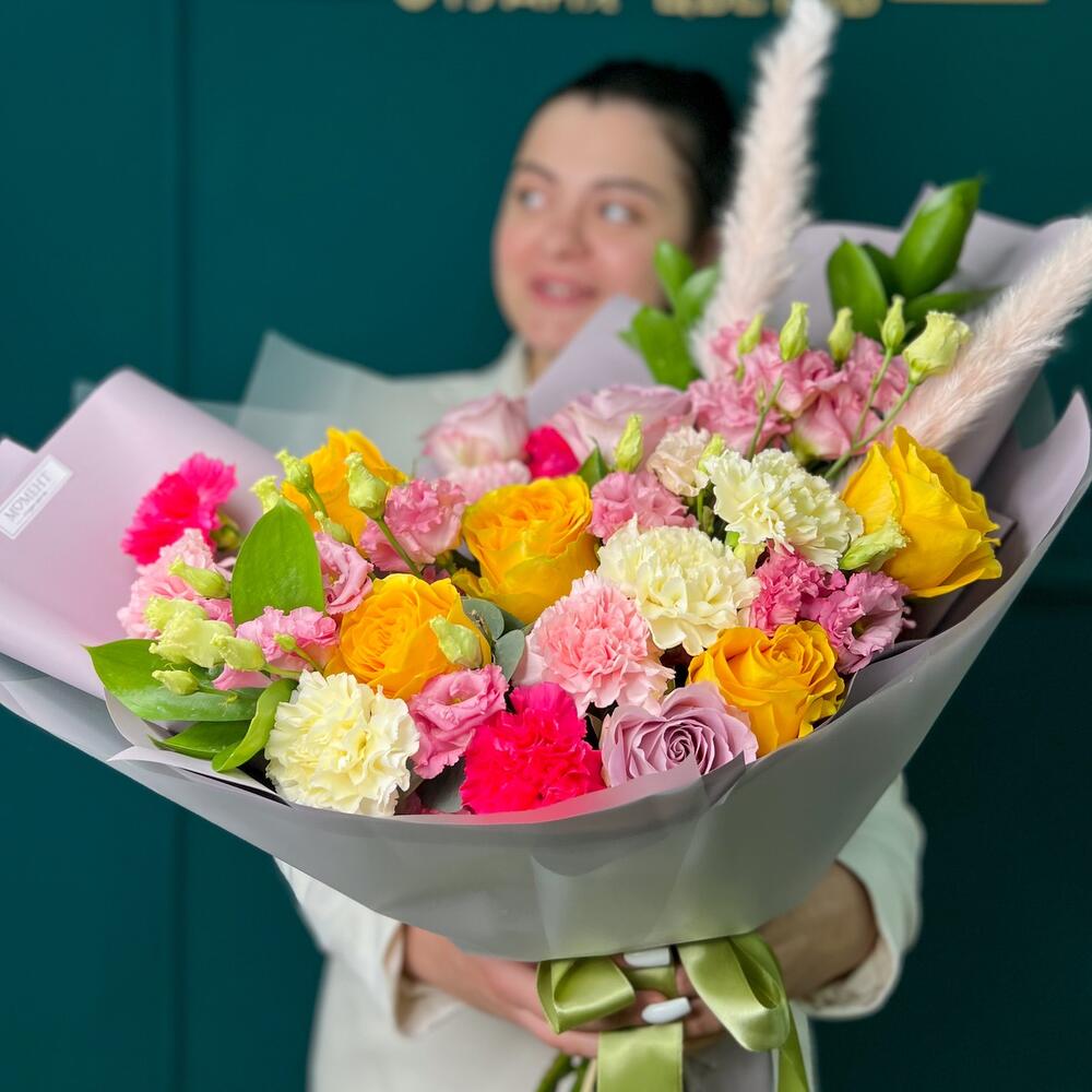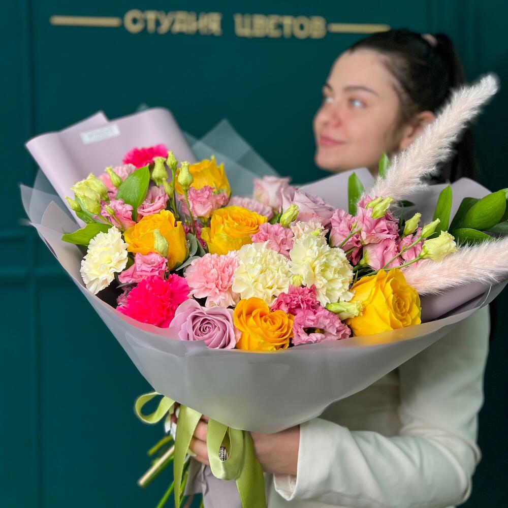 Стильный, яркий, шикарный, большой букет из роз, лизиантуса, диантусов и мускуса