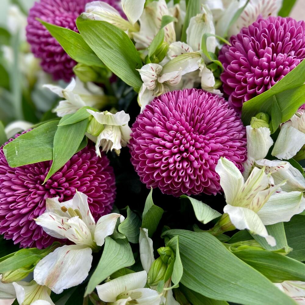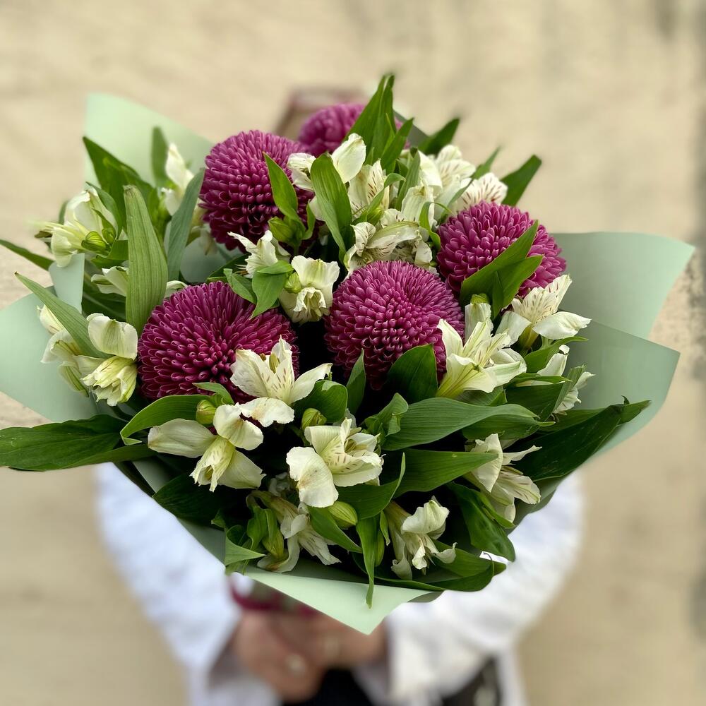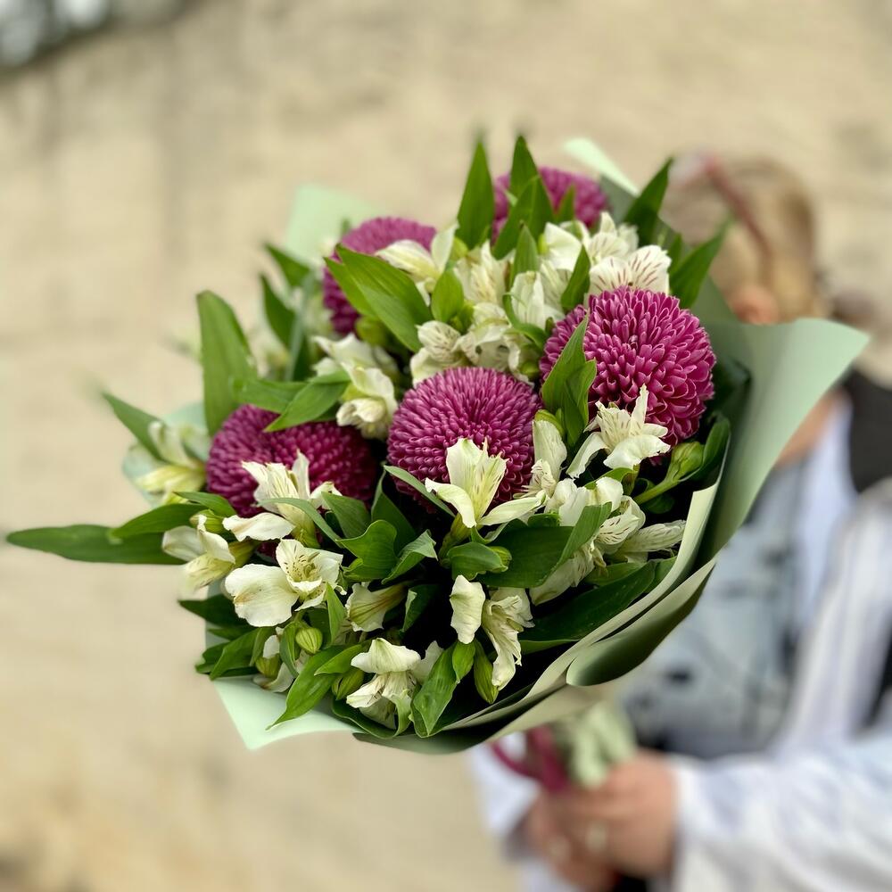Альстромерия - 8 шт. Хризантема - 5 шт. Лента атласная - 1 шт. Матовая пленка - 3 шт.