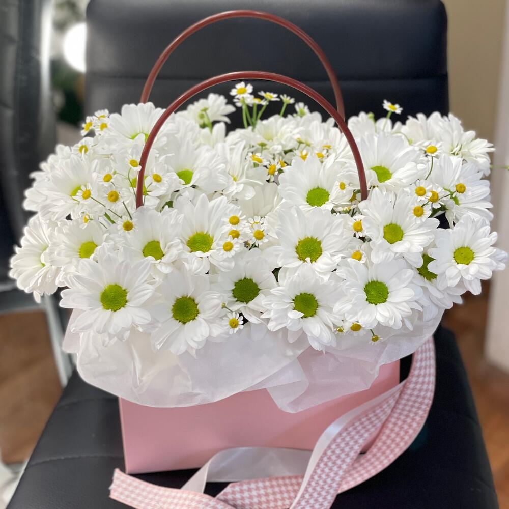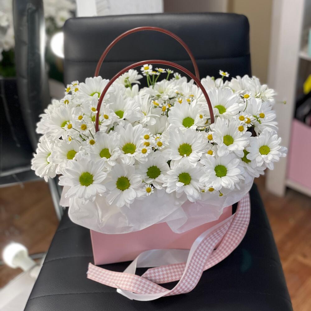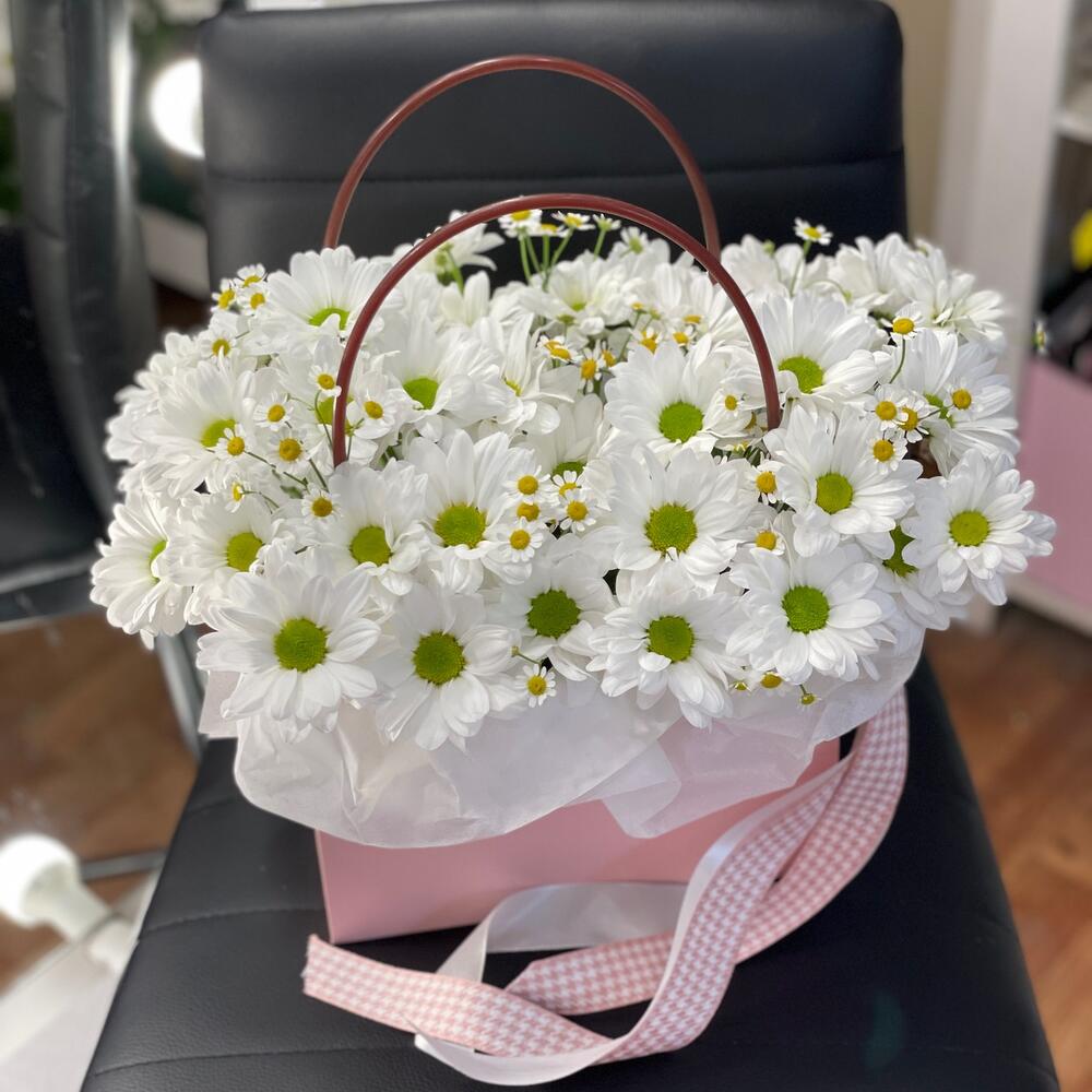 Хризантема кустовая - 4 шт. Матрикария - 2 шт. Сумочка - 1 шт. Оазис флористический - 1 шт. Бумага тишью - 1 шт. ленты атласные - 2 шт.
