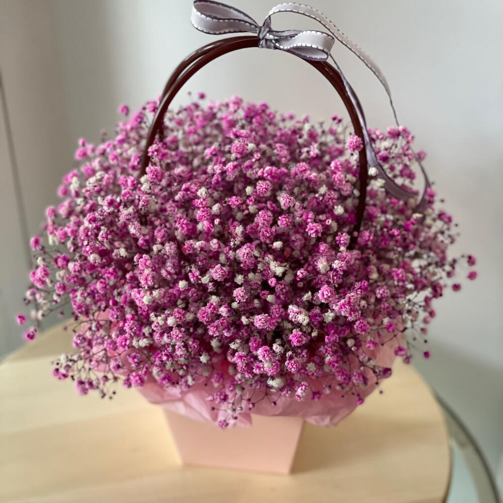 Гипсофила – 5 шт. Лента атласная – 1 шт. Сумочка – 1 шт. Оазис флористический – 1 шт. Бумага тишью – 1 шт.
