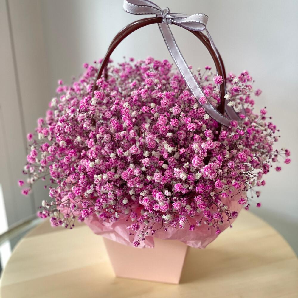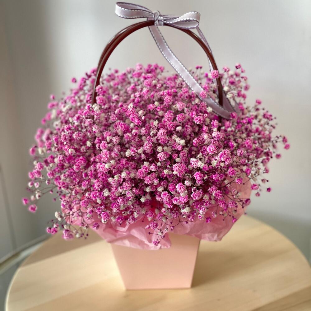Гипсофила - 5 шт. Лента атласная - 1 шт. Сумочка - 1 шт. Оазис флористический - 1 шт. Бумага тишью - 1 шт.