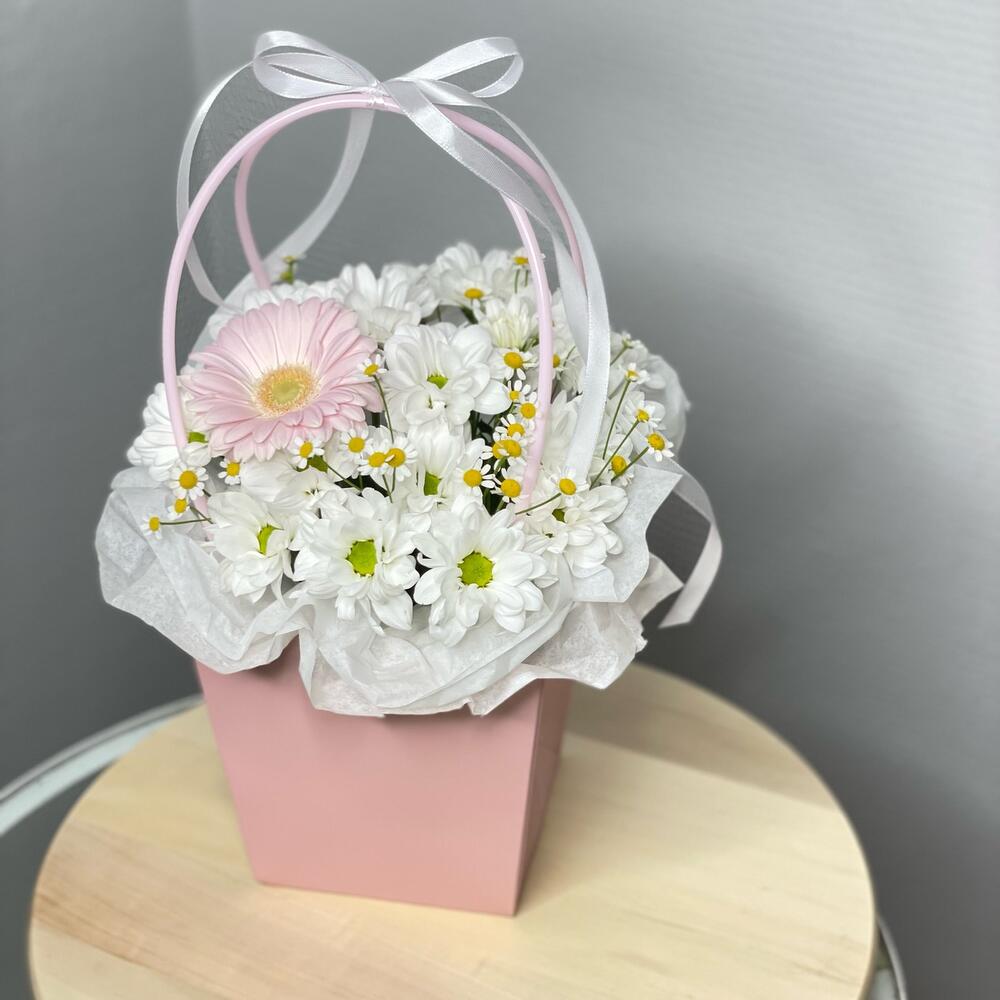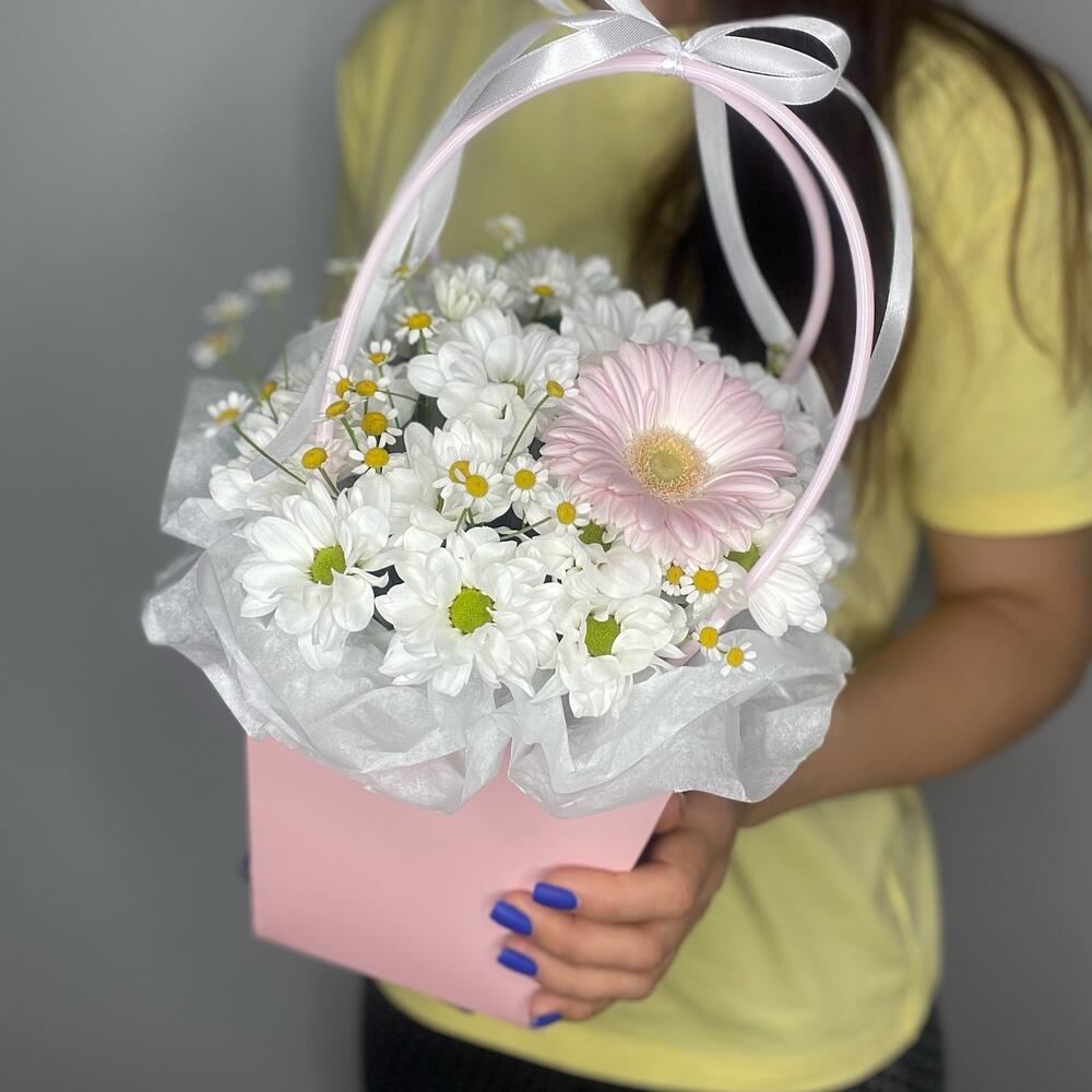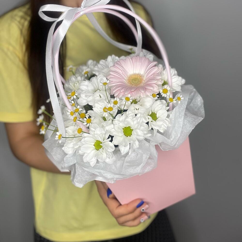 Хризантема кустовая - 3 шт. Лента атласная - 1 шт. Гербера - 1 шт. Матрикария - 1 шт. Сумочка - 1 шт. Оазис флористический - 1 шт. Бумага тишью - 1 шт.