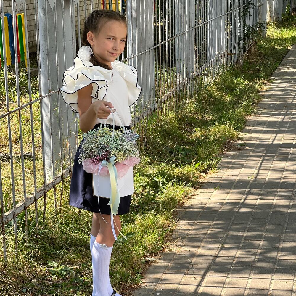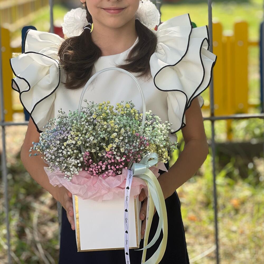 Лента атласная – 1 шт. Оазис флористический – 1 шт. Сумочка картонная – 1 шт. Бумага тишью – 1 шт. гипсофила радужная – 5 шт.