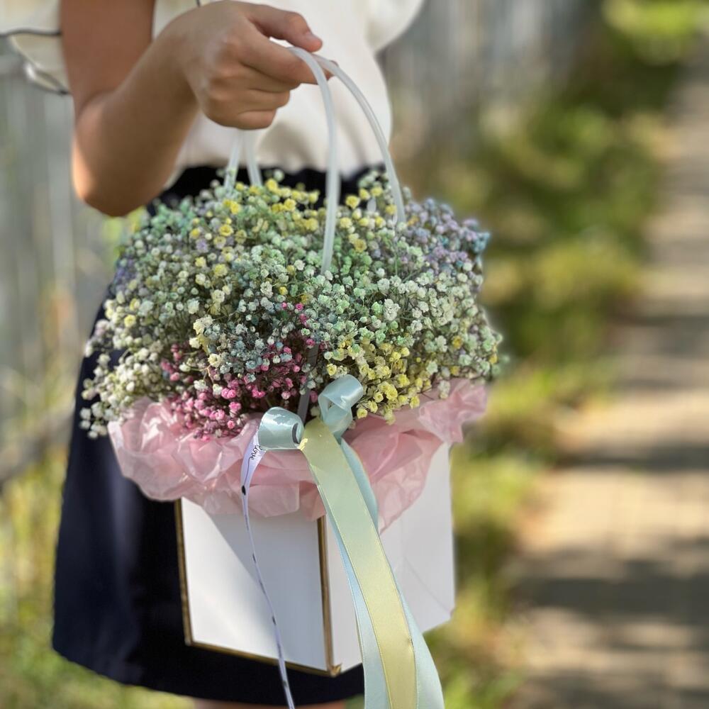 Лента атласная - 1 шт. Оазис флористический - 1 шт. Сумочка картонная - 1 шт. Бумага тишью - 1 шт. гипсофила радужная - 5 шт.