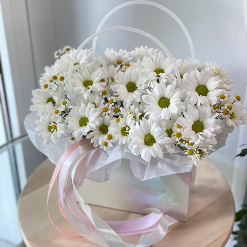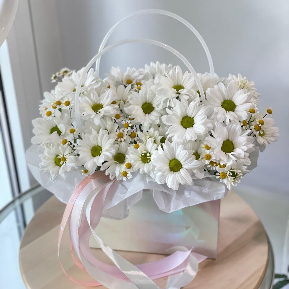 Хризантема кустовая - 4 шт. Лента атласная - 3 шт. Матрикария - 3 шт. Оазис флористический - 1 шт. Сумочка картонная - 1 шт. Бумага тишью - 1 шт.