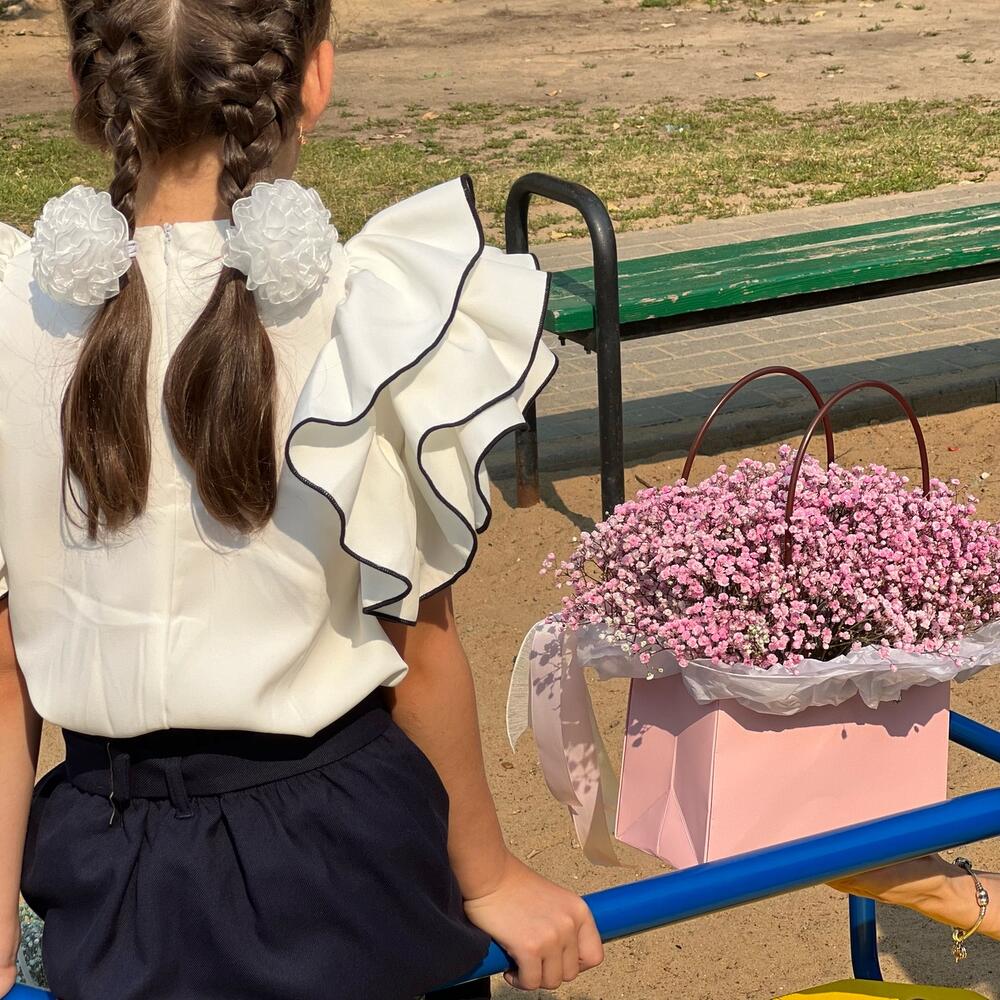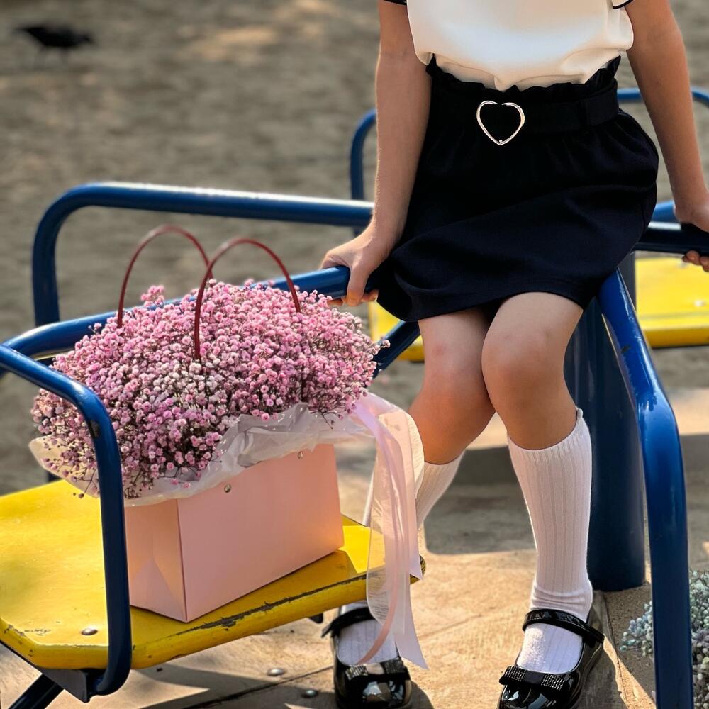 Гипсофила – 7 шт. Лента атласная – 2 шт. Оазис флористический – 1 шт. Сумочка картонная – 1 шт. Бумага тишью – 1 шт.