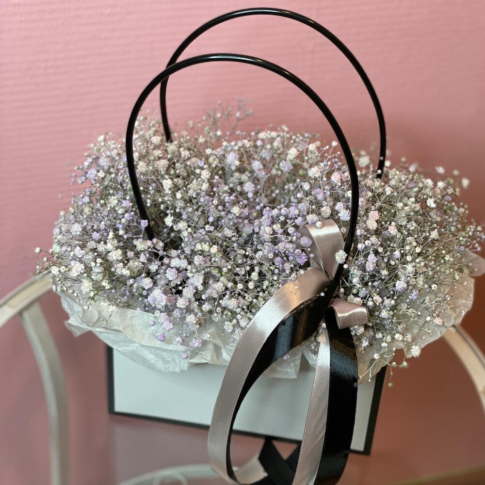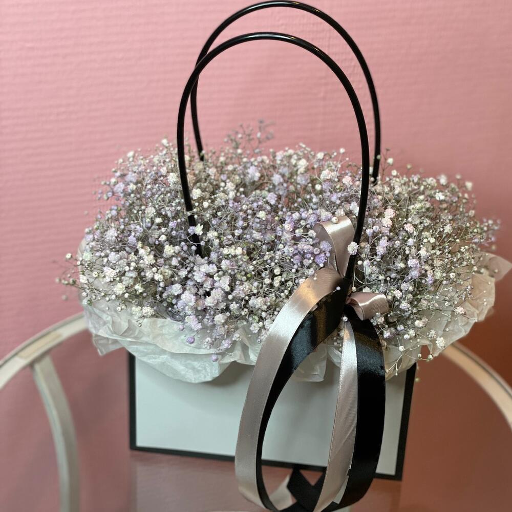 Гипсофила – 6 шт. Лента атласная – 2 шт. Оазис флористический – 1 шт. Сумочка картонная – 1 шт. Бумага тишью – 1 шт.