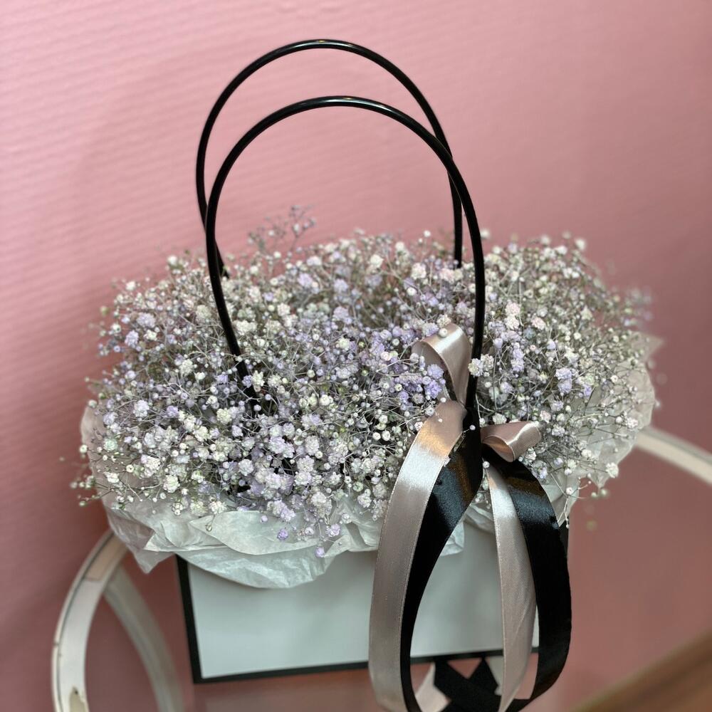 Гипсофила - 6 шт. Лента атласная - 2 шт. Оазис флористический - 1 шт. Сумочка картонная - 1 шт. Бумага тишью - 1 шт.