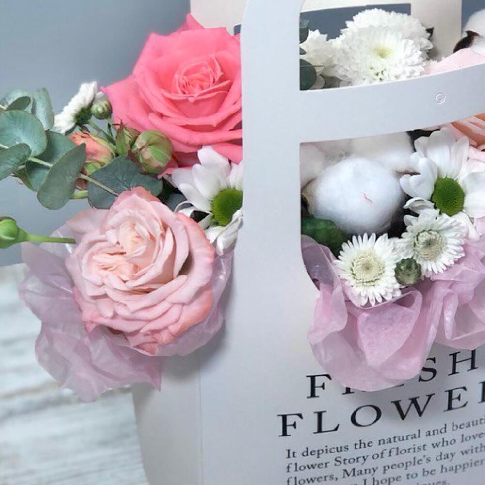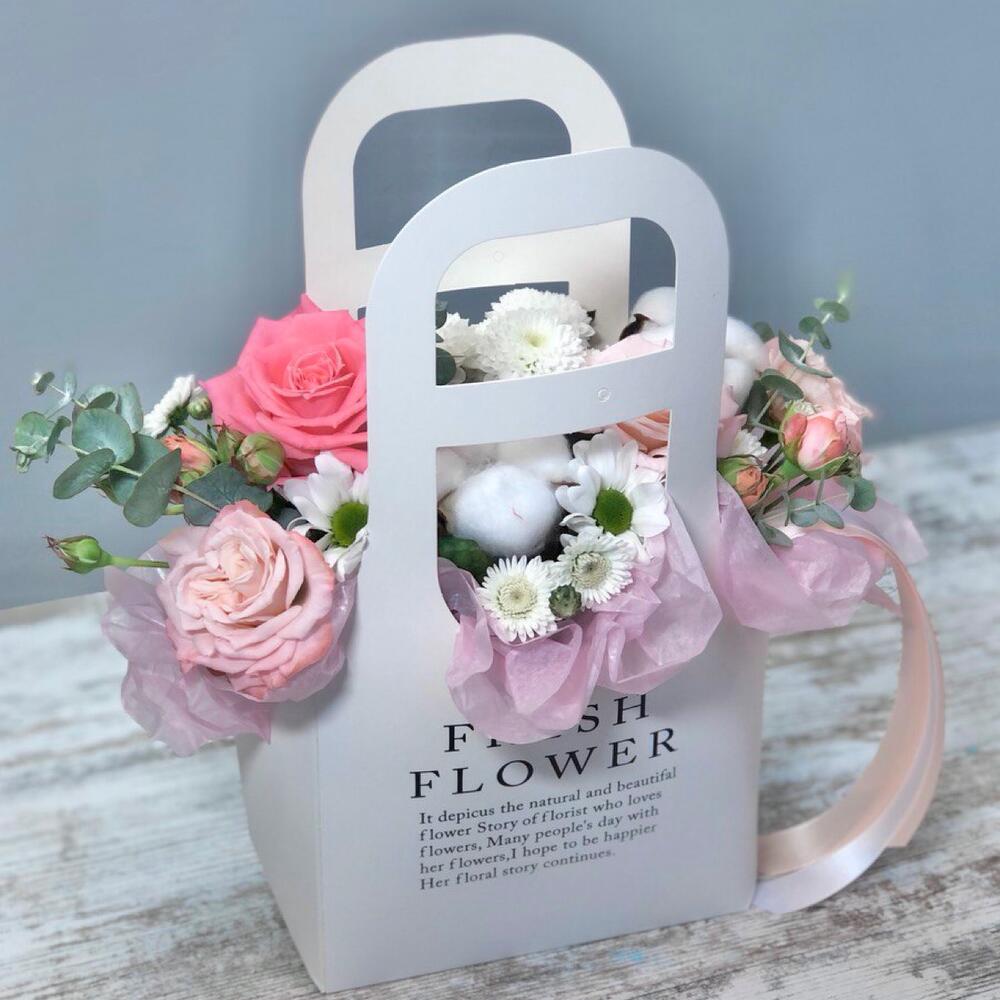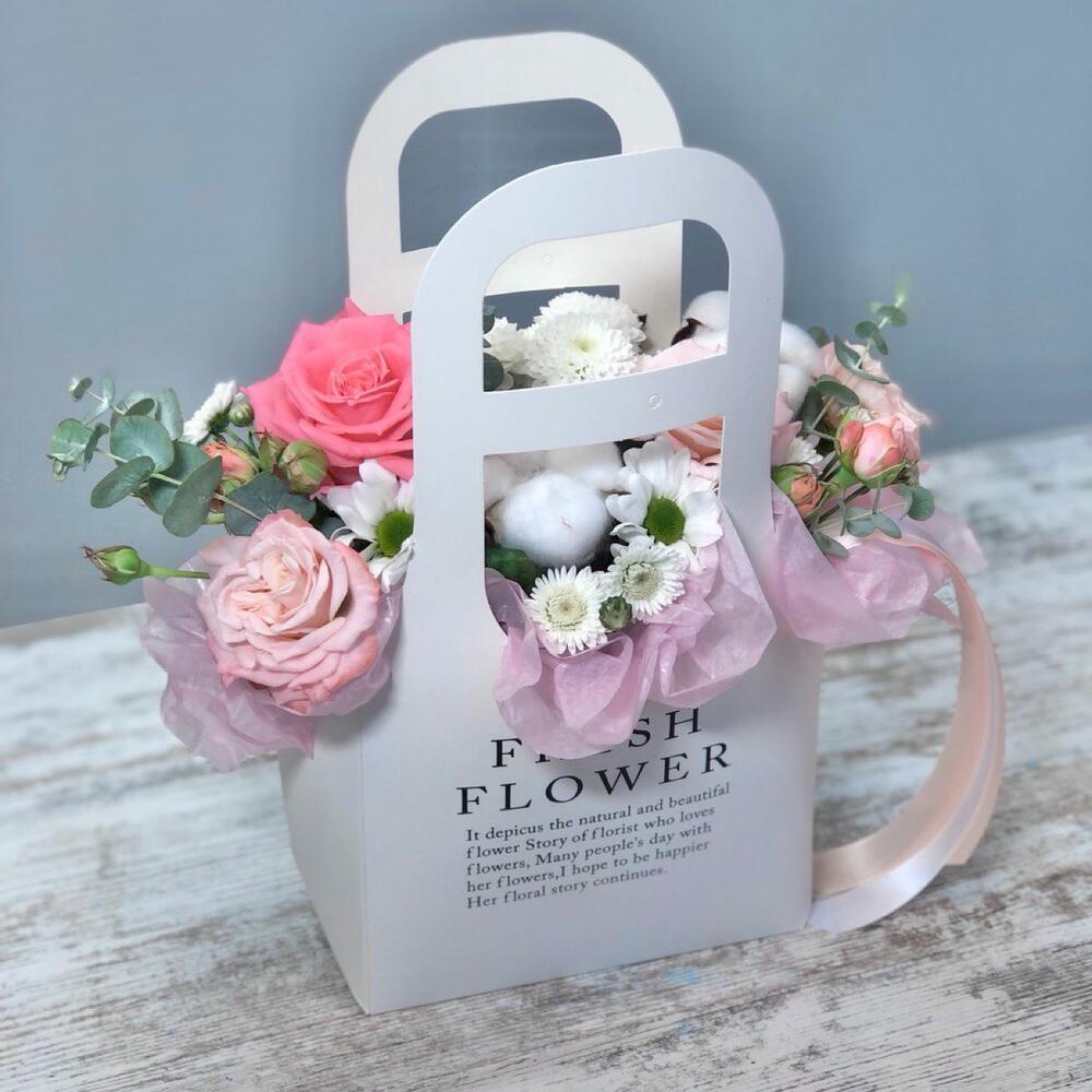 Нежная белая крафтовая сумочка с очаровательными разнофактурными цветами идеально подобранными нашими флористами для гармоничного сочетания в одной композиции. Композицию можно заказать в нашем магазине на доставку на 14 февраля, 8 марта, день рождения, свадьбу, юбилей, свидание или как просто комплимент.Открытка с Вашими пожеланиями абсолютно бесплатно