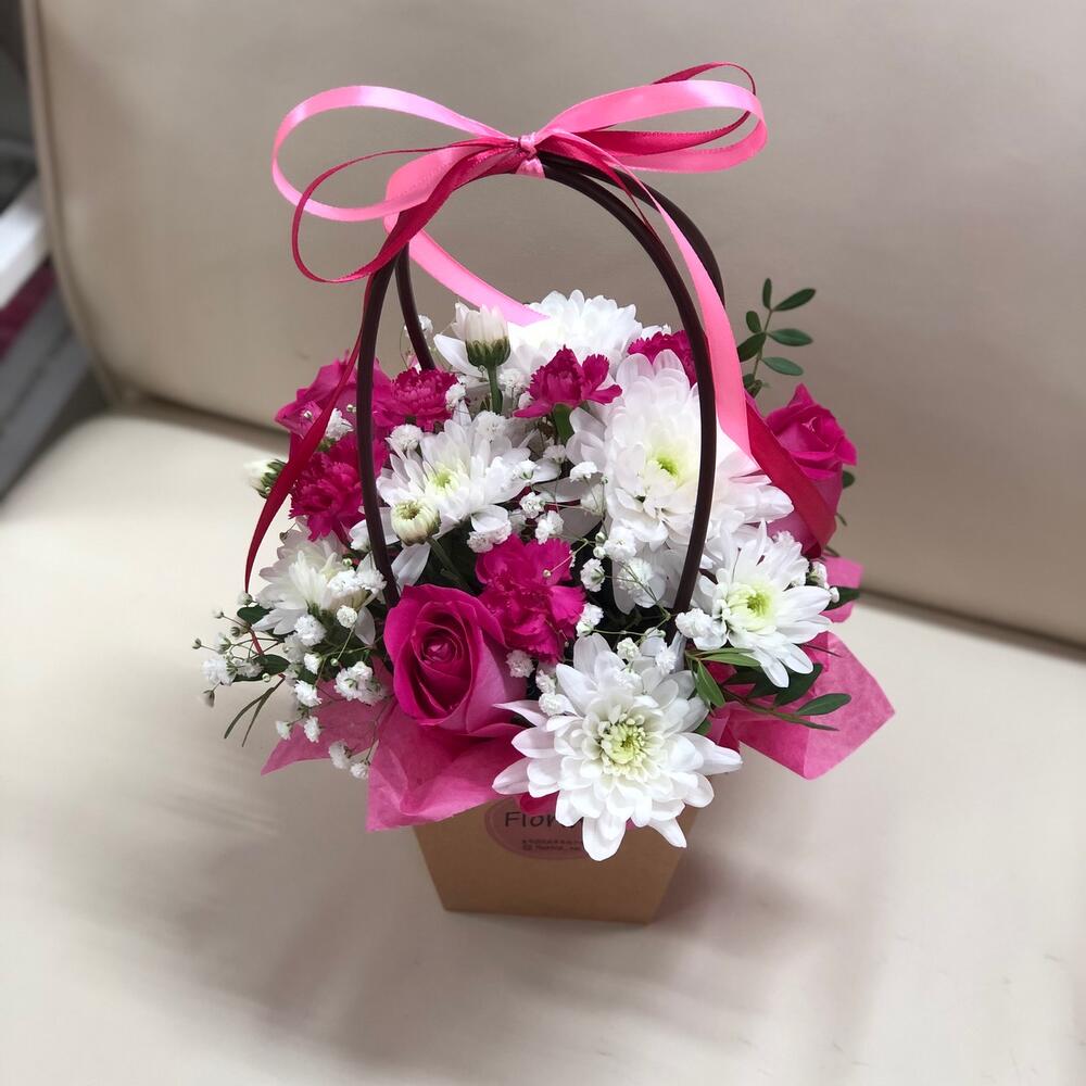 Оазис флористический – 1 шт. Тишью розовая – 1 шт. сумочка с ручками – 1 шт. микс цветов – 5 шт.