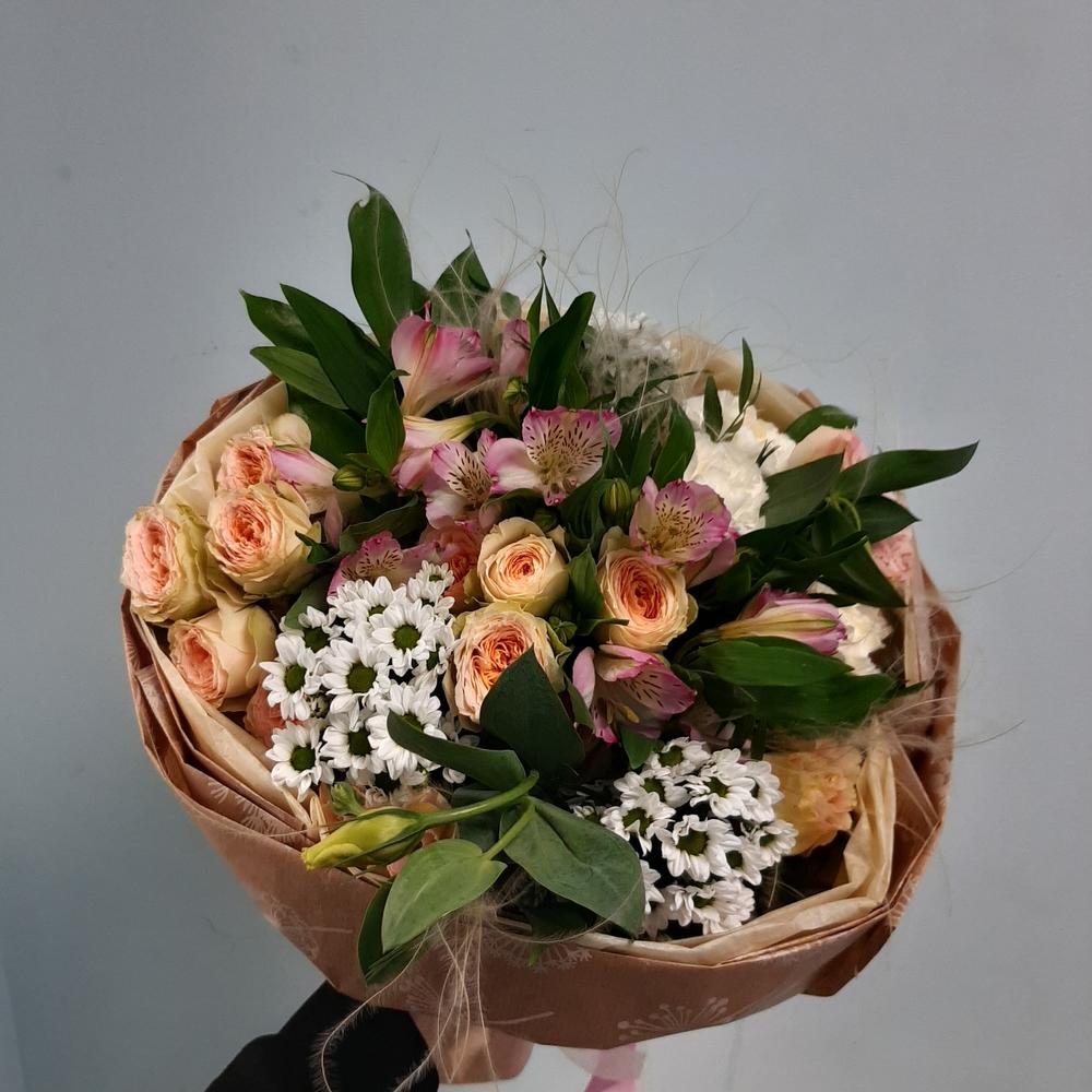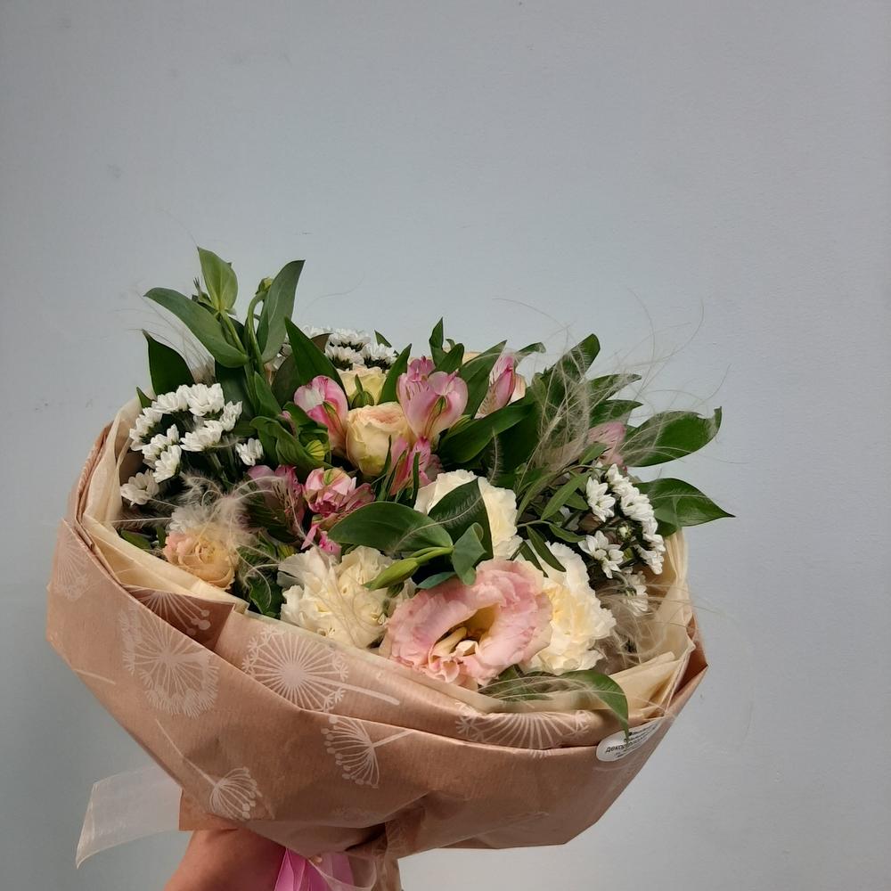 Альстромерия – 2 шт. Писташ – 1 шт. Роза кустовая – 2 шт. Рускус – 3 шт. Хризантема кустовая – 3 шт. Эустома – 2 шт. Лента атласная – 1 шт. Диантус – 3 шт. Крафт упаковка – 1 шт. Калька упаковка – 1 шт.