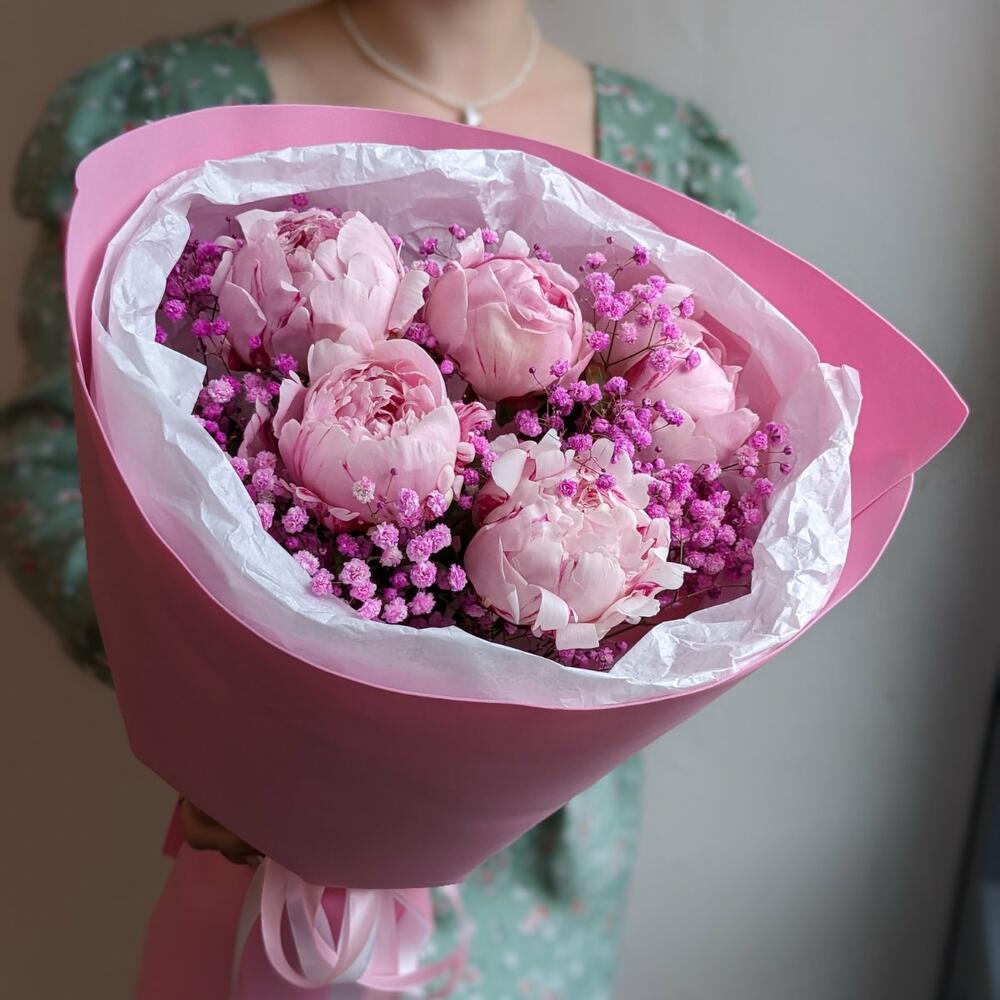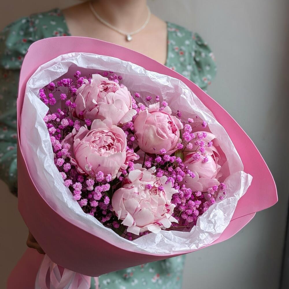 Гипсофила - 1 шт. Лента - 1 шт. Упаковка - 1 шт. пионы - 5 шт.