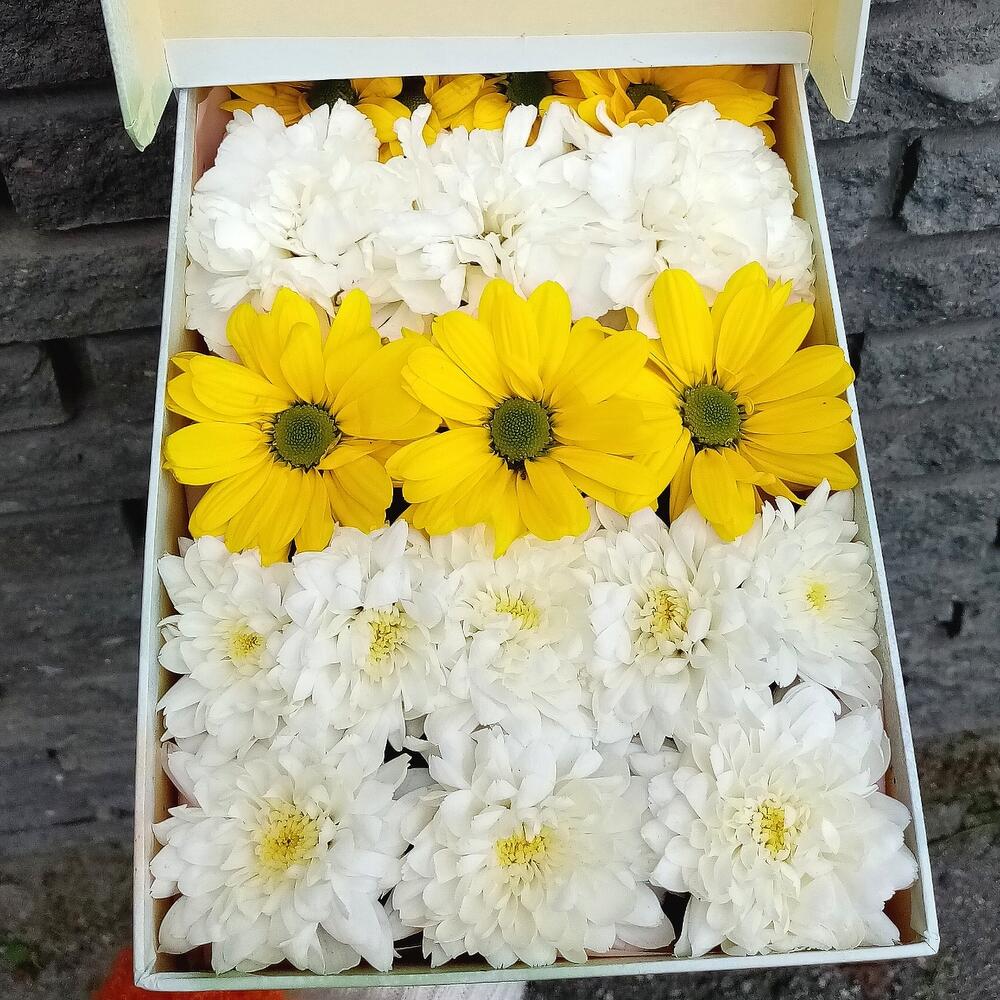 Хризантема кустовая - 5 шт. Коробка дизайнерская - 1 шт. Оазис флористический - 1 шт.