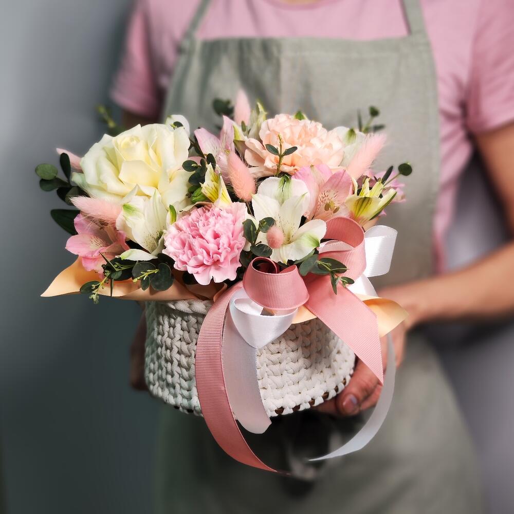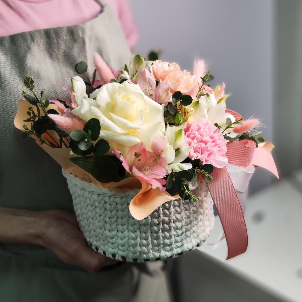 Композиция в уютной белой вязанной корзинке в розовой гамме.