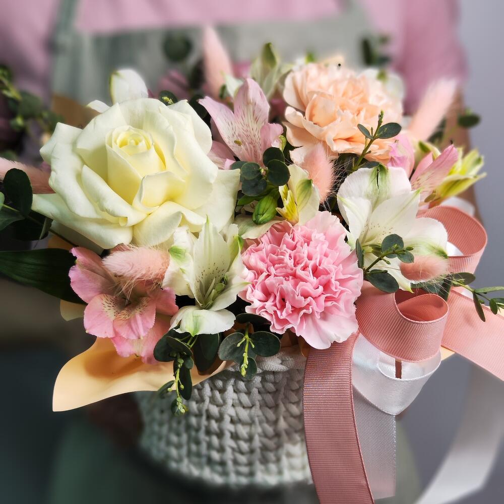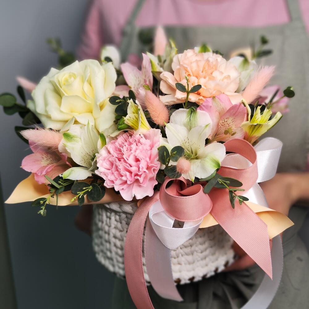 Гвоздика розовая – 1 шт. Лента атласная – 2 шт. Альстромерия белая – 2 шт. Альстромерия розовая – 1 шт. Гвоздика персиковая – 1 шт. Эвкалипт первифолиа – 2 шт. роза белая вывернутая – 1 шт. лаугурус персиковый – 7 шт. корзина белая вязанная – 1 шт.