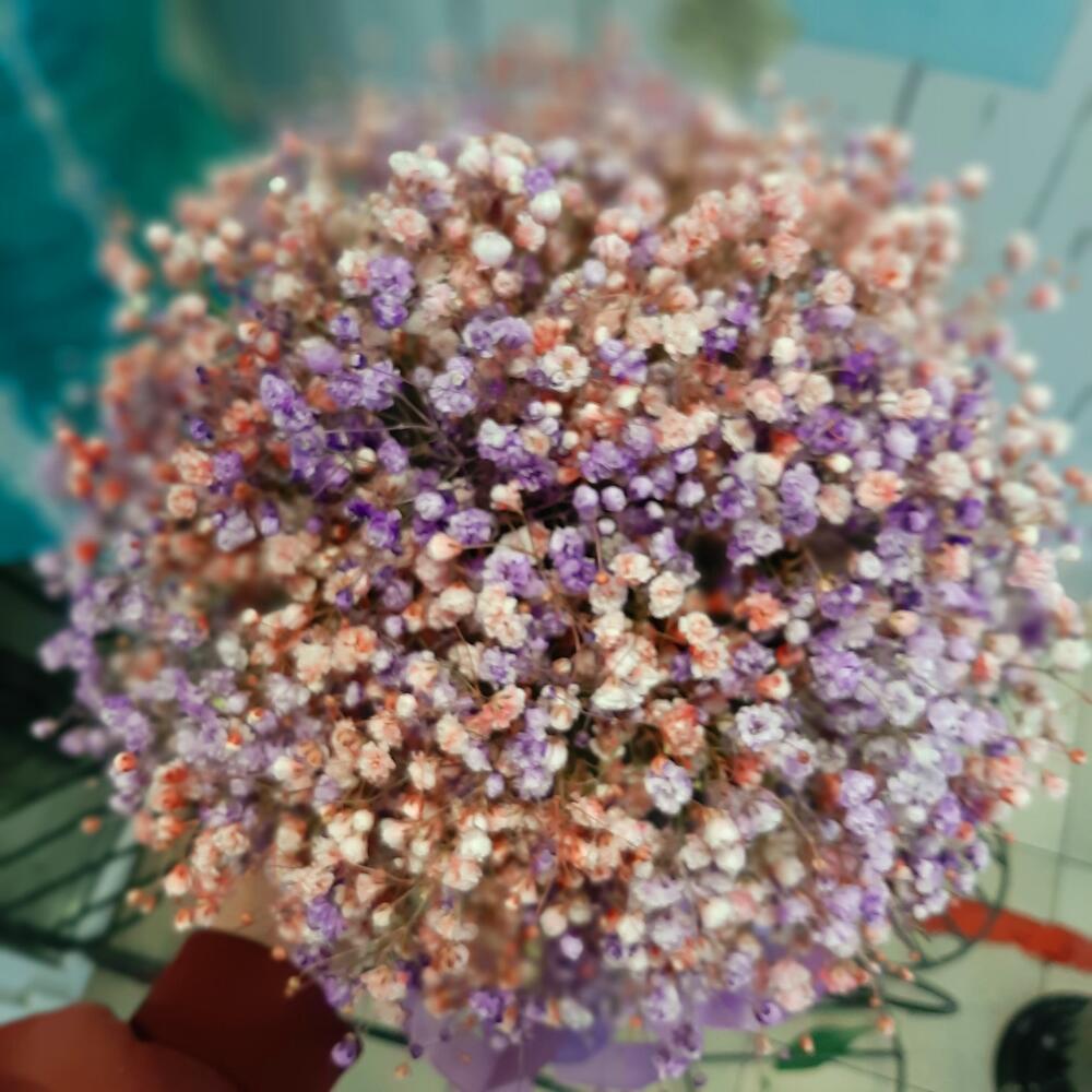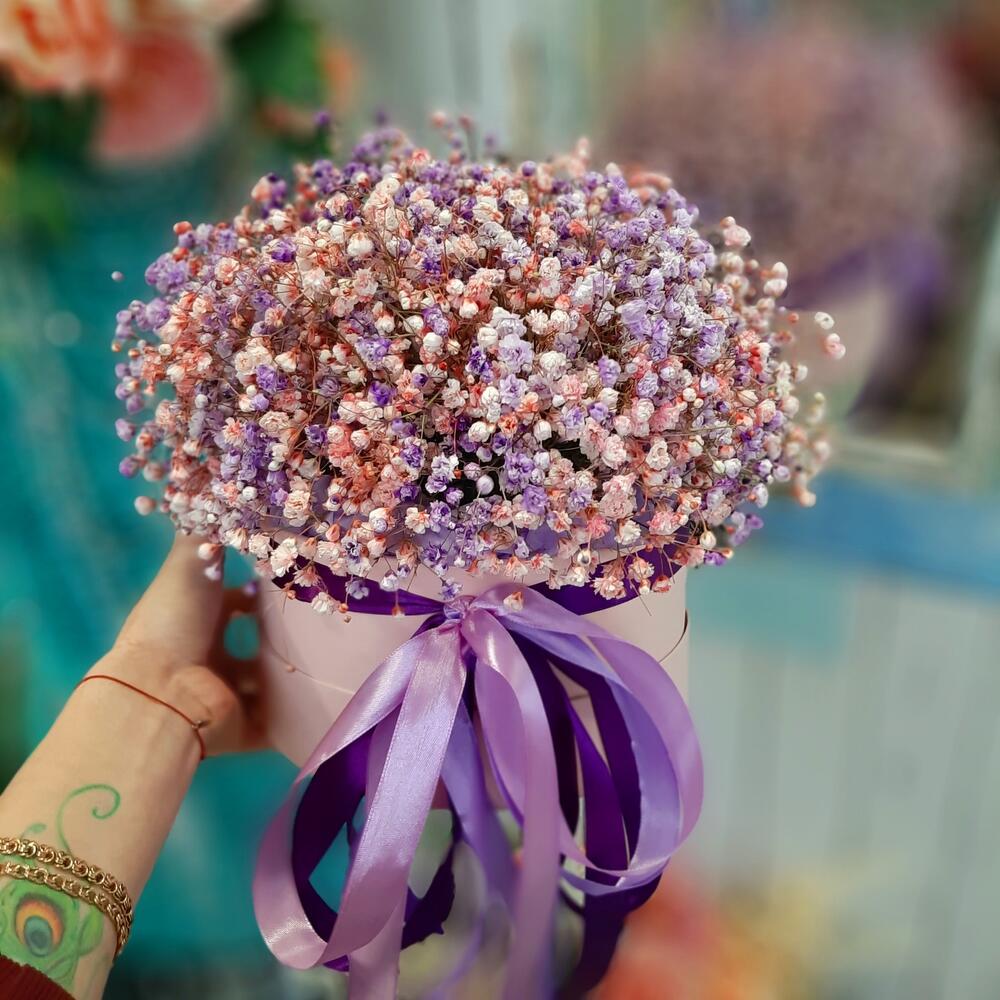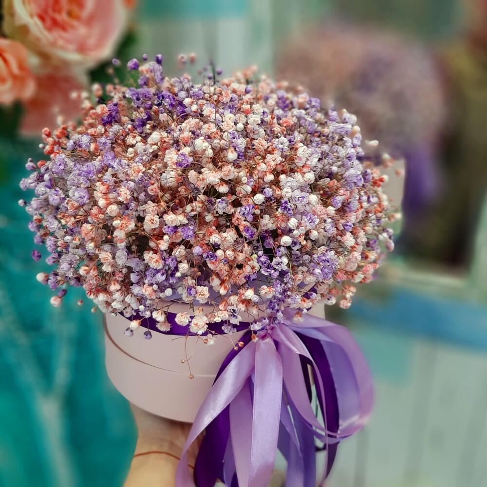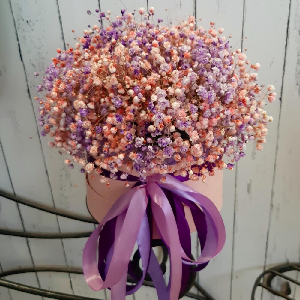 Лента атласная - 3 шт. Коробка шляпная - 1 шт. Оазис флористический - 1 шт. гипсофила радужная - 9 шт.