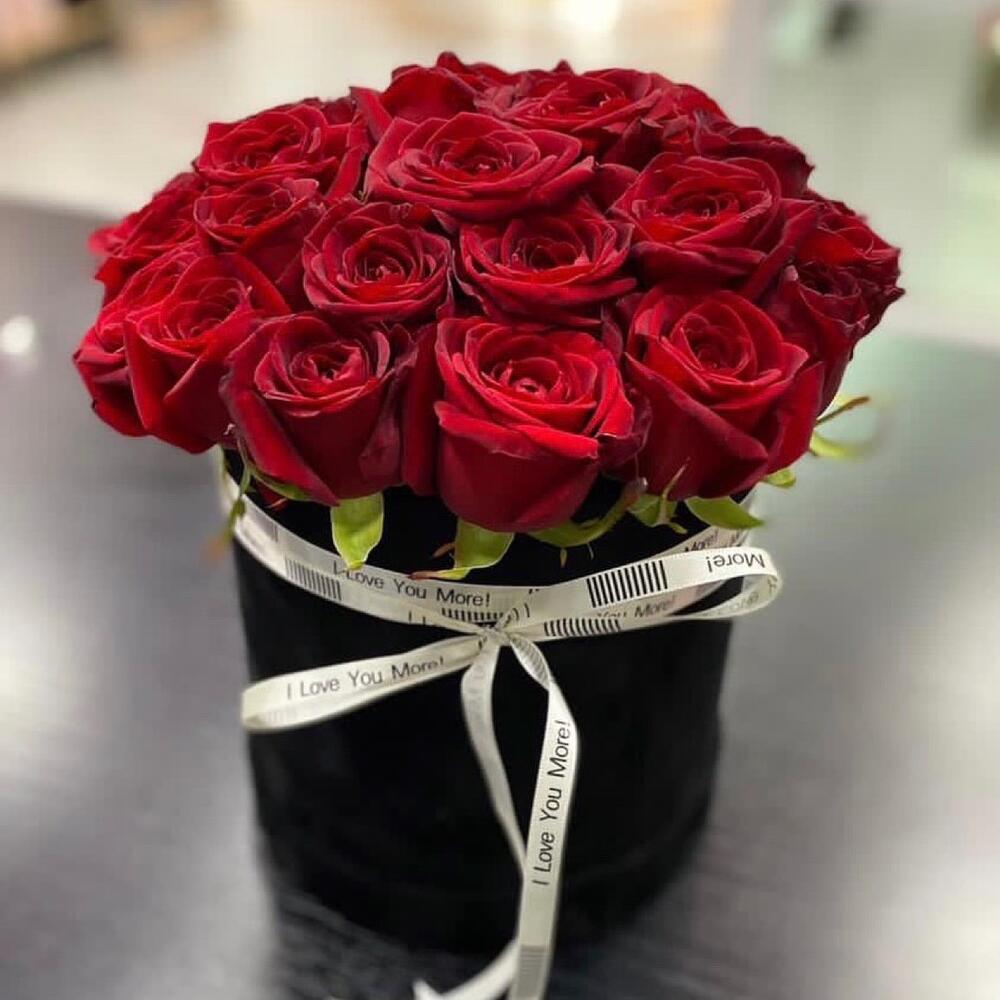 Коробка шляпная – 1 шт. Оазис флористический – 1 шт. роза ред наймоми – 25 шт.