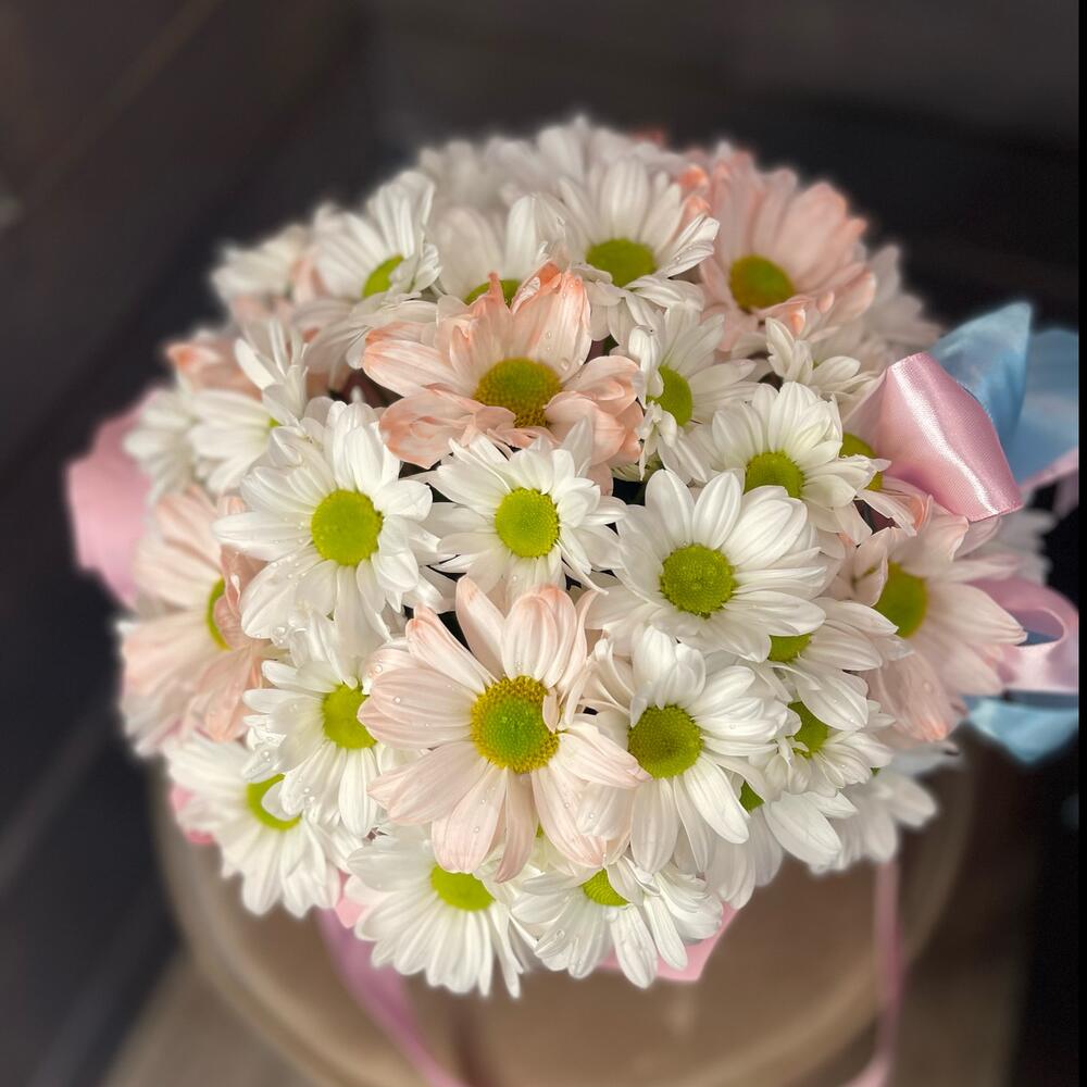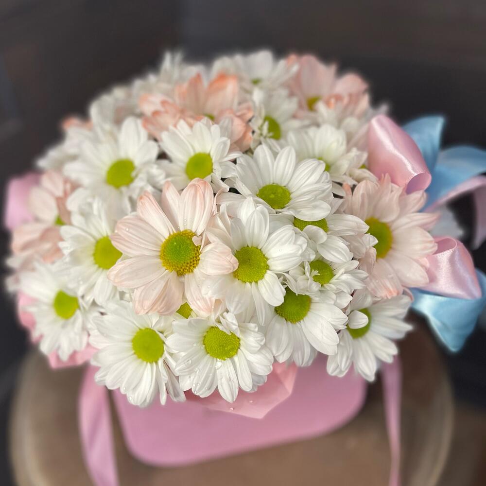 Хризантема кустовая - 6 шт. Лента атласная - 2 шт. Коробка - 1 шт. Оазис флористический - 1 шт.