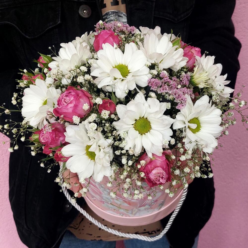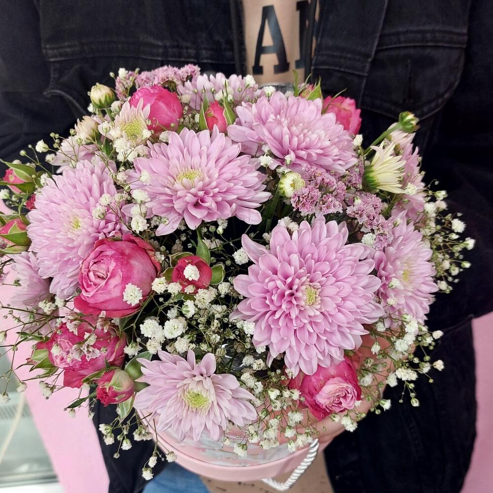 Гипсофила – 2 шт. Роза кустовая – 3 шт. Хризантема кустовая – 2 шт. Шляпная коробка – 1 шт.