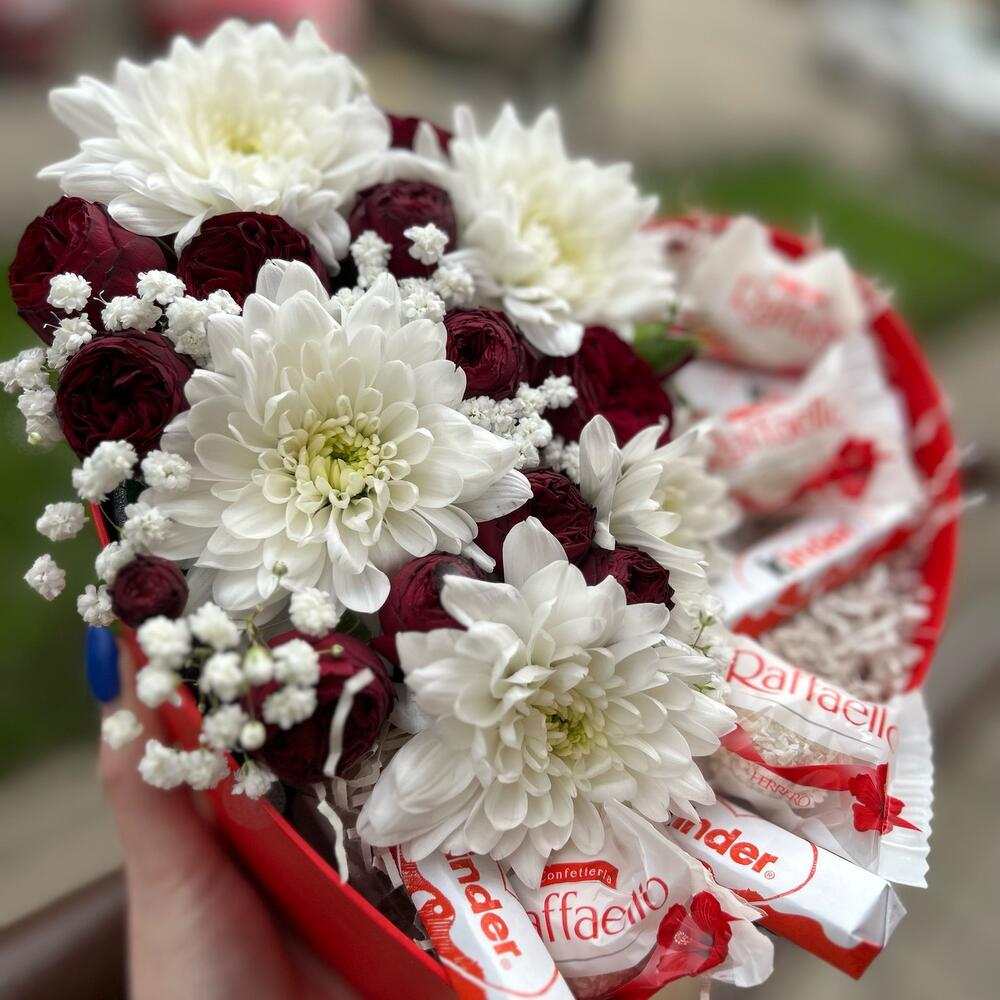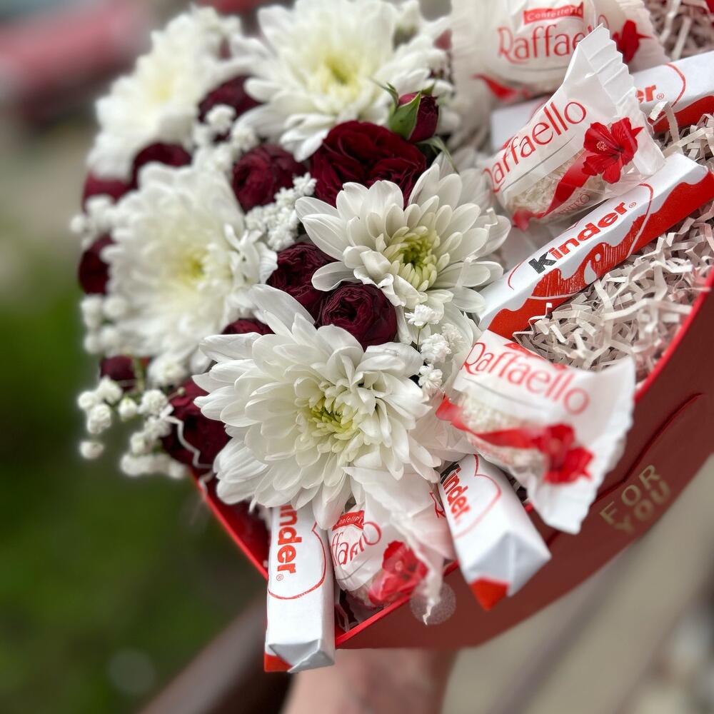 Хризантема кустовая - 1 шт. Кустовая роза - 1 шт. Раффаэлло - 4 шт. Коробка сердце - 1 шт. Киндер шоколад - 4 шт.