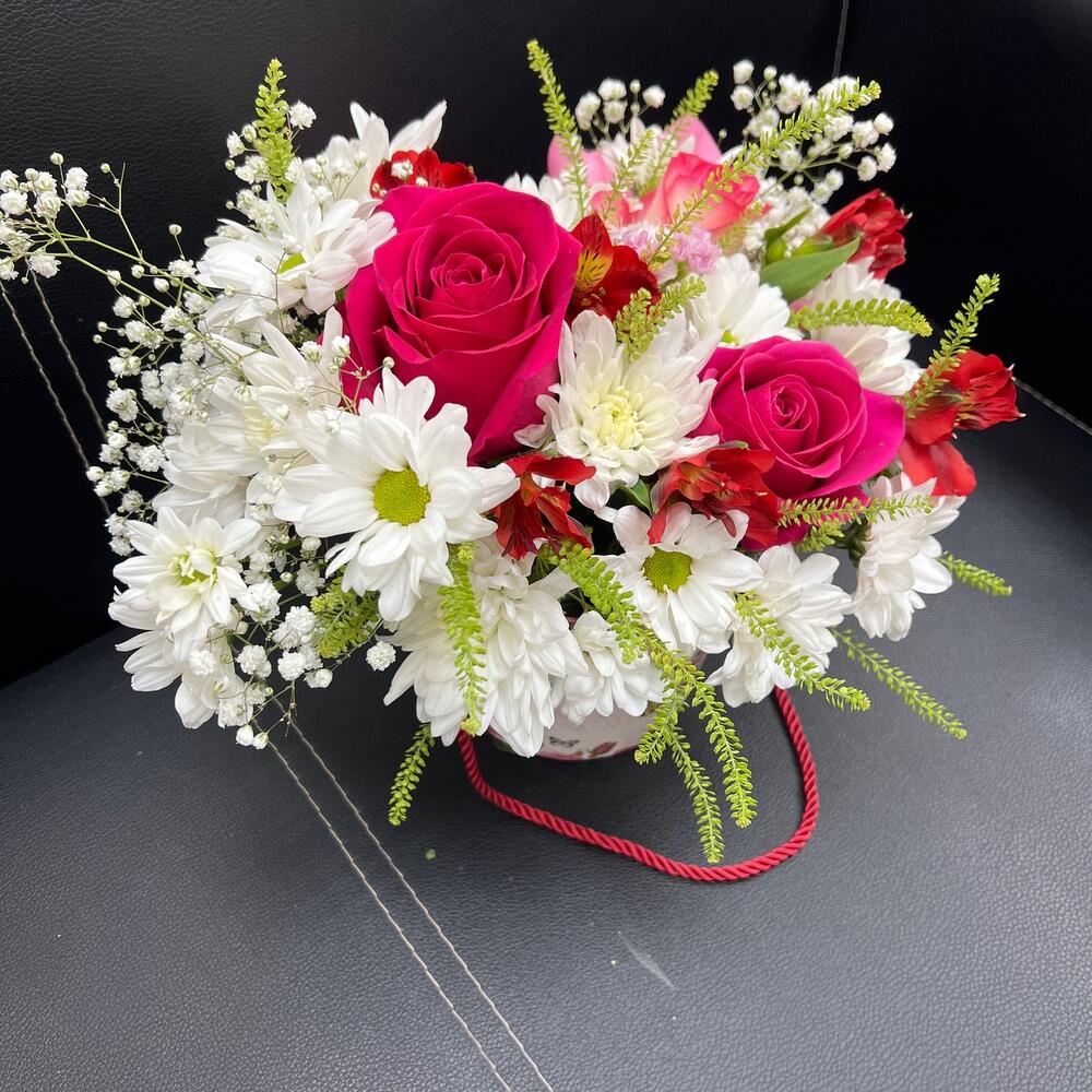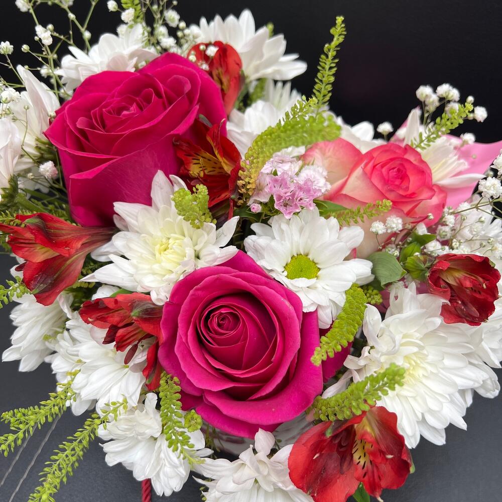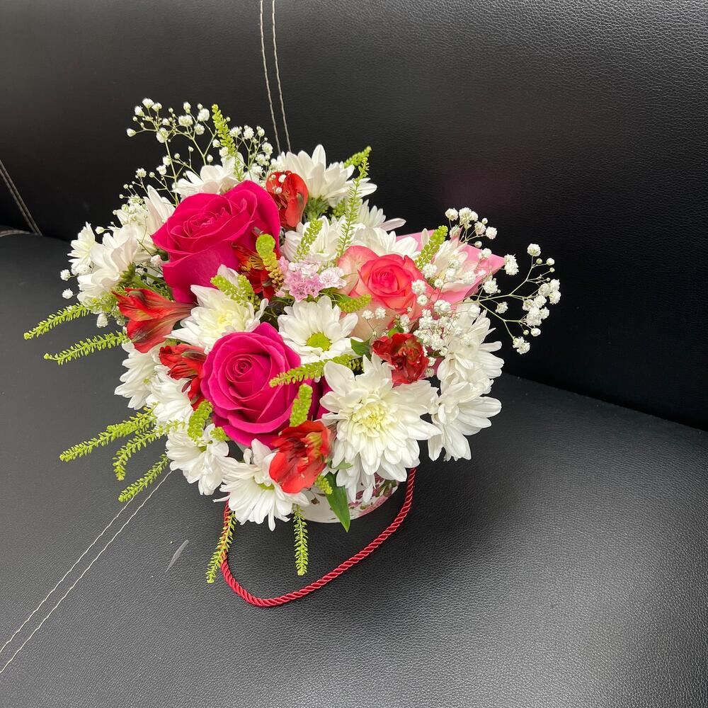 Альстромерия - 1 шт. Гипсофила - 1 шт. Хризантема кустовая - 2 шт. Роза Россия - 1 шт. Коробка - 1 шт. Оазис флористический - 1 шт. роза эвквадор - 2 шт.