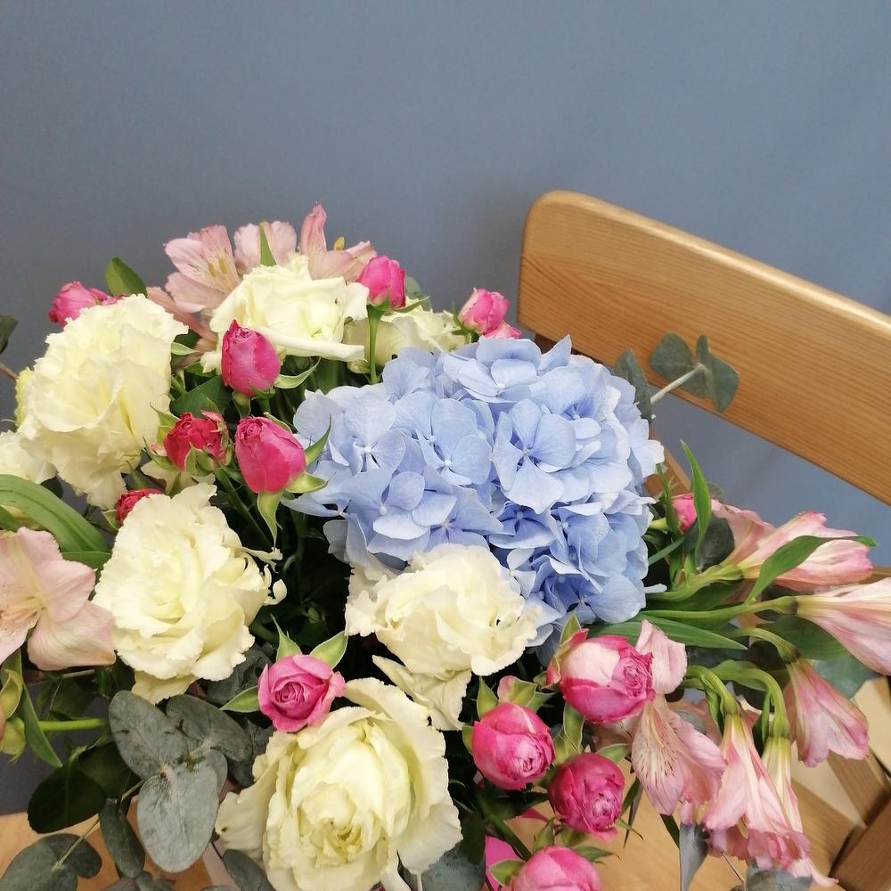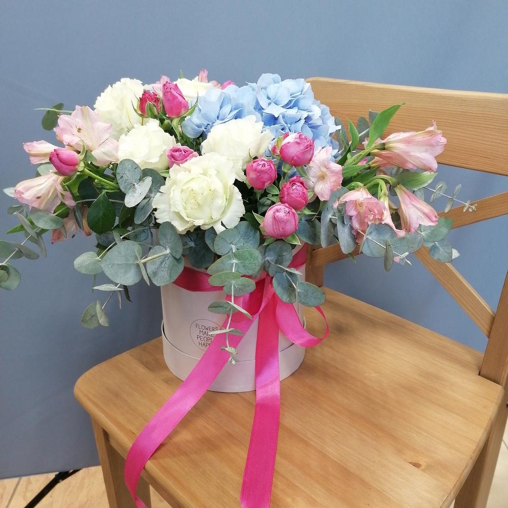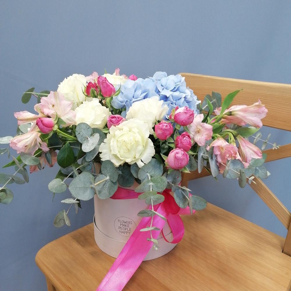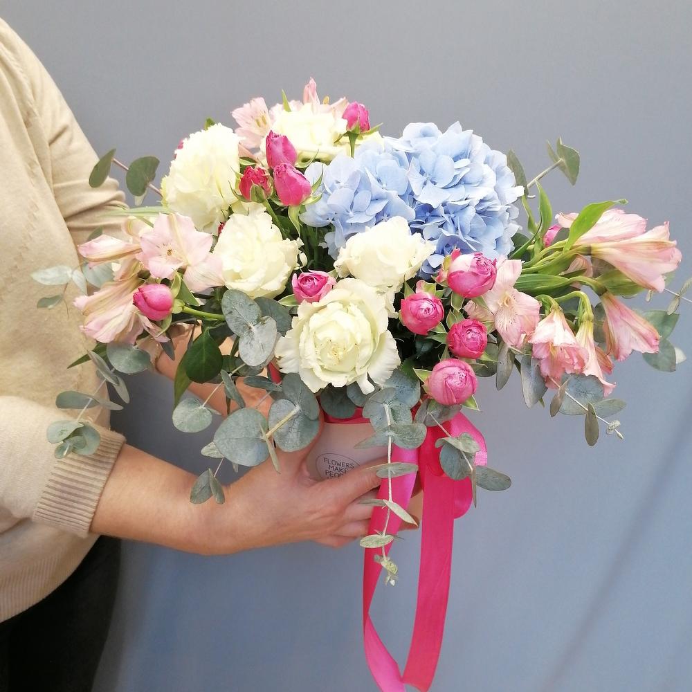 Альстромерия - 3 шт. Гортензия - 2 шт. Эвкалипт - 3 шт. Кустовая роза - 3 шт. Эустома - 2 шт. Лента атласная - 1 шт. Коробка - 1 шт. Оазис флористический - 1 шт.