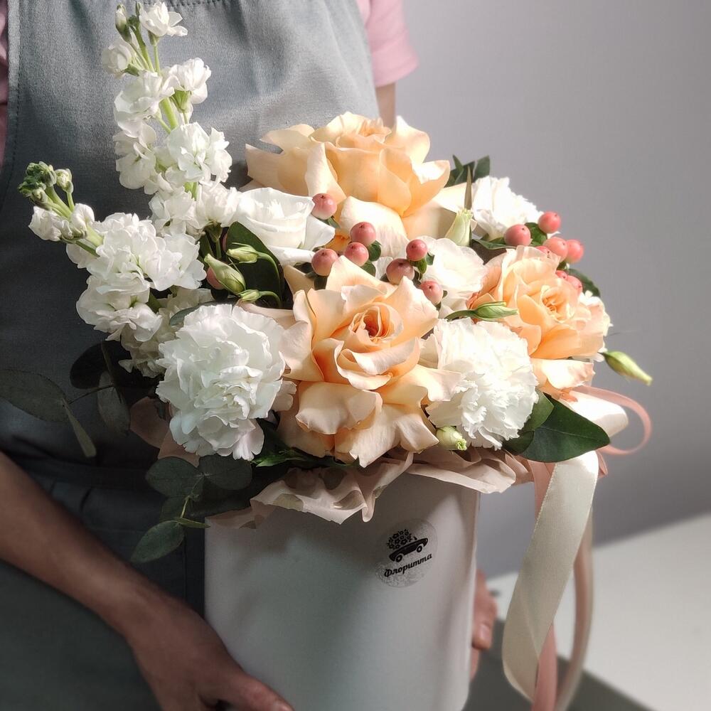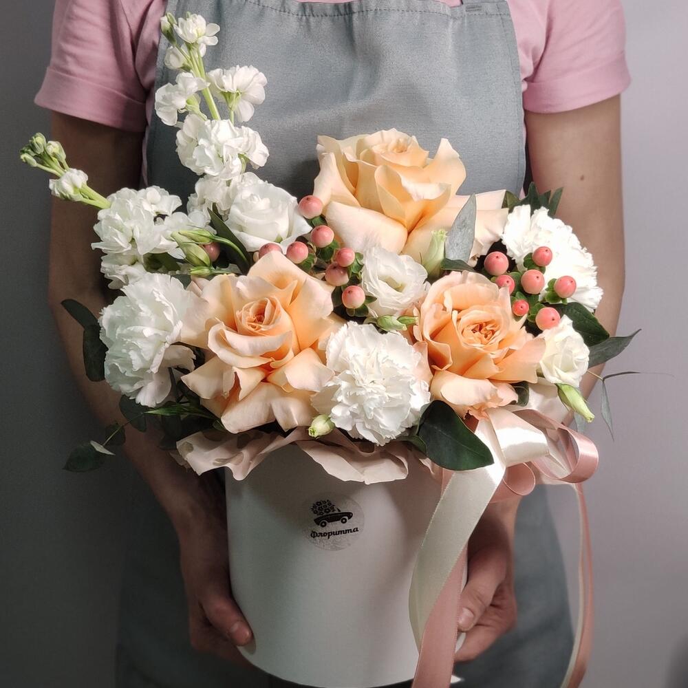 Эвкалипт – 2 шт. Лента атласная – 2 шт. Коробка шляпная – 1 шт. Гвоздика белая – 3 шт. Лизиантус белый – 1 шт. Гиперикум розовый – 2 шт. Маттиола белая – 2 шт. тишью кремовое – 1 шт. роза шиммер пионовидная – 3 шт.