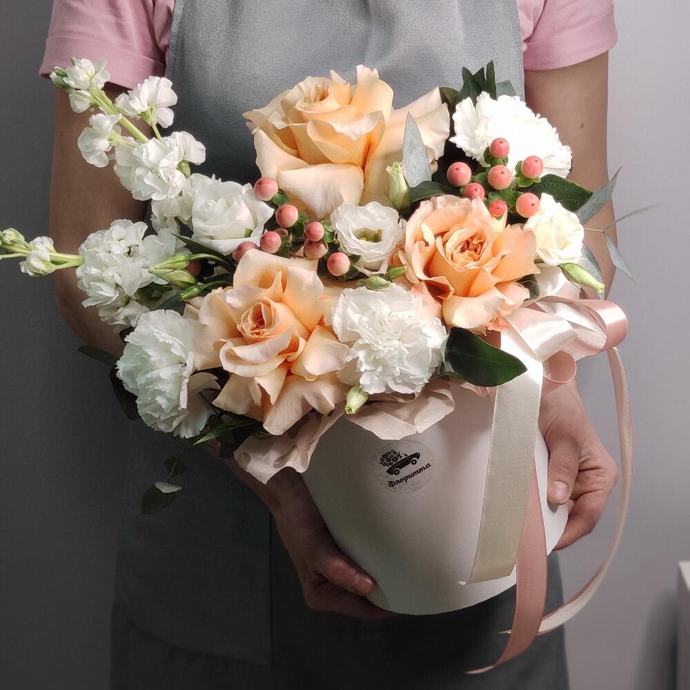 Эвкалипт - 2 шт. Лента атласная - 2 шт. Коробка шляпная - 1 шт. Гвоздика белая - 3 шт. Лизиантус белый - 1 шт. Гиперикум розовый - 2 шт. Маттиола белая - 2 шт. тишью кремовое - 1 шт. роза шиммер пионовидная - 3 шт.