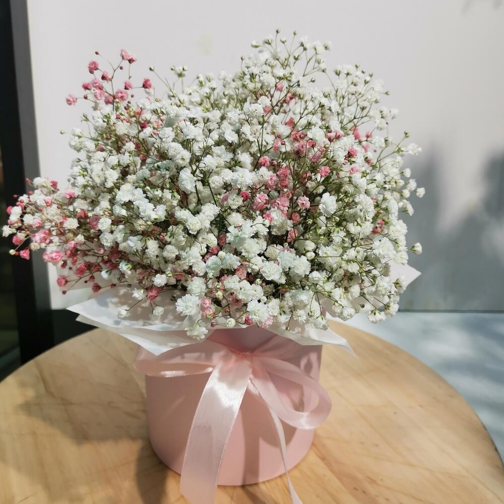 Гипсофила – 6 шт. Коробка шляпная – 1 шт. Оазис флористический – 1 шт.