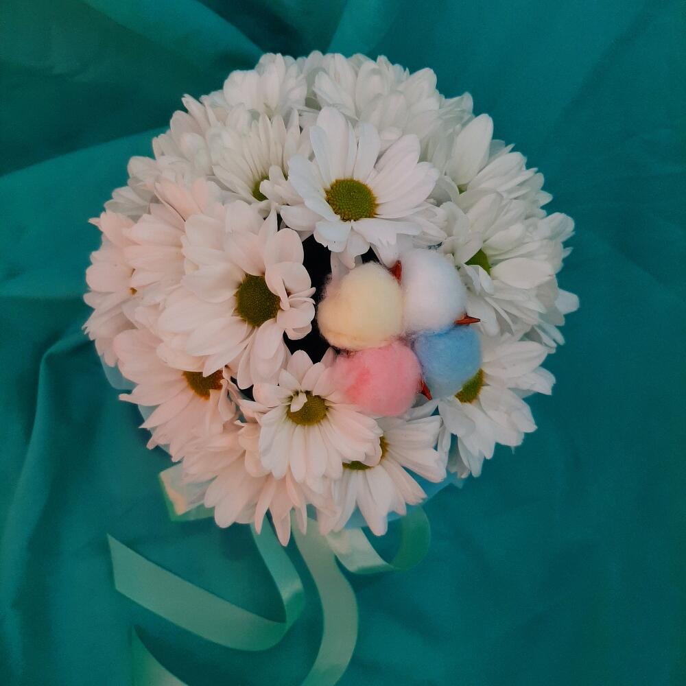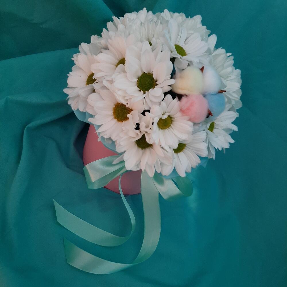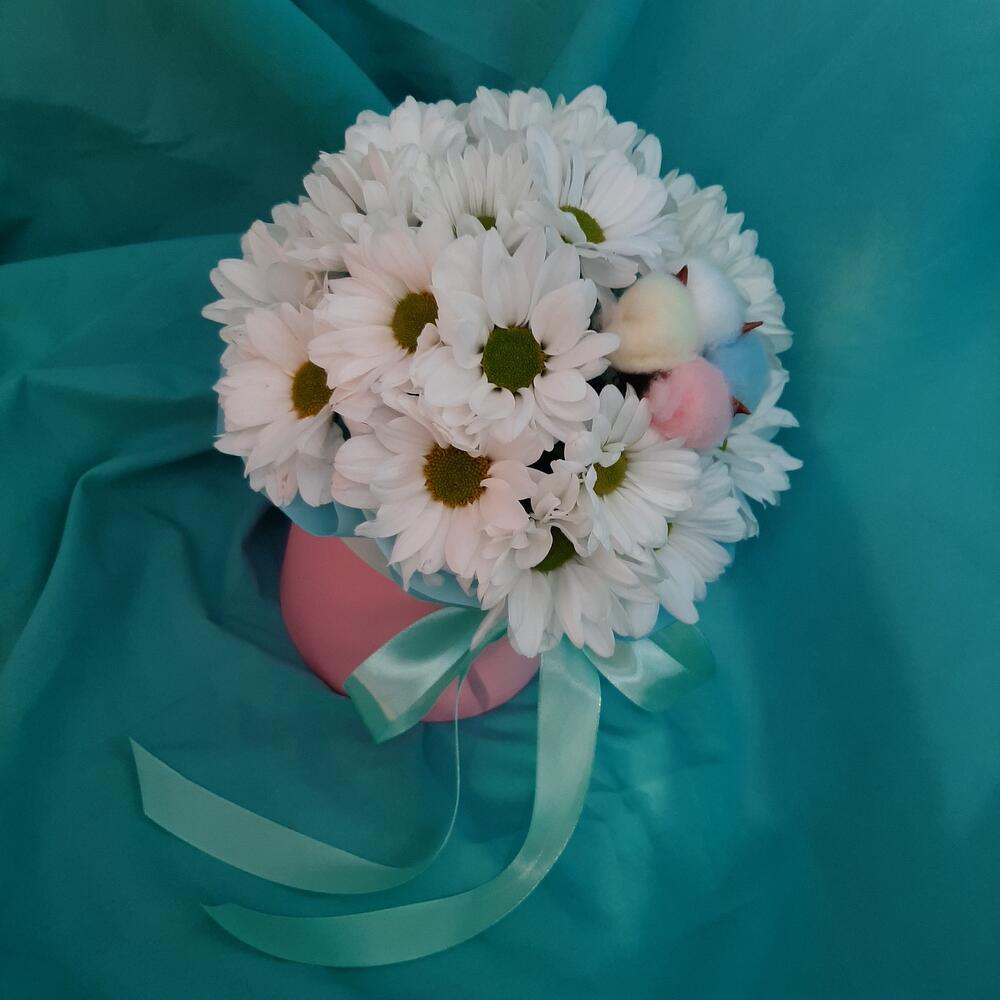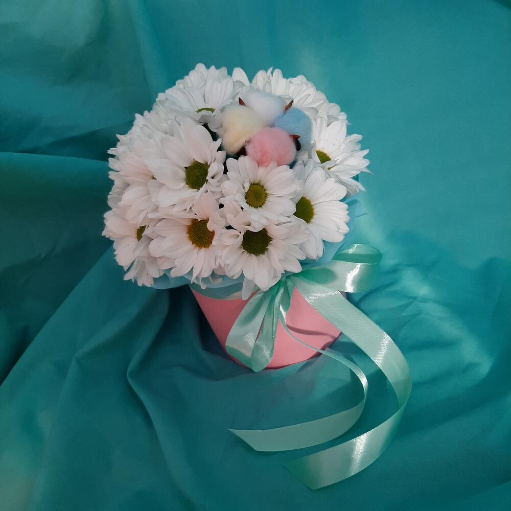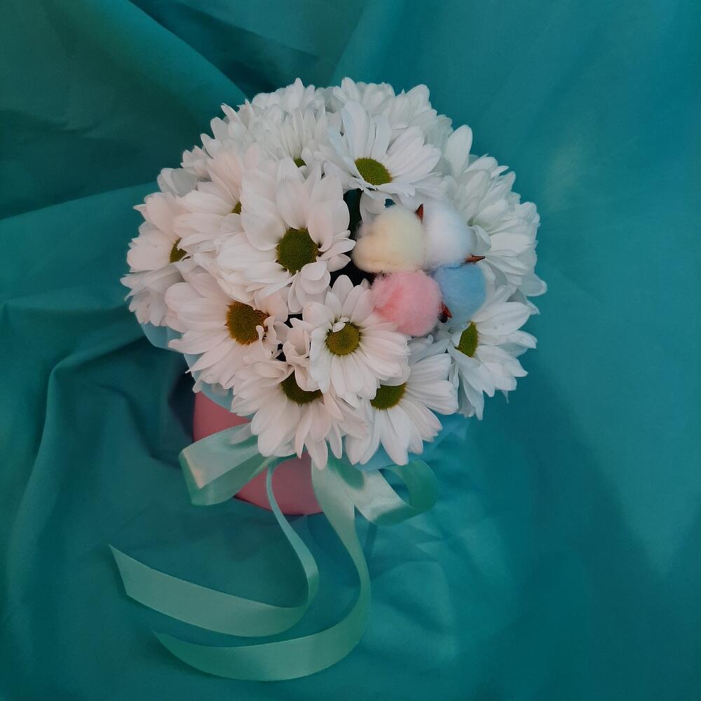 Хлопок - 1 шт. Хризантема кустовая - 3 шт. Лента атласная - 1 шт. Коробка шляпная - 1 шт. Оазис флористический - 1 шт.
