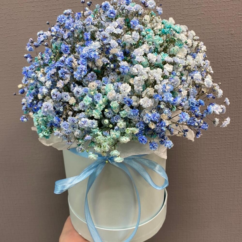 Гипсофила – 5 шт. Оазис флористический – 1 шт. ленты атласные – 1 шт. коробка круглая шляпная – 1 шт.