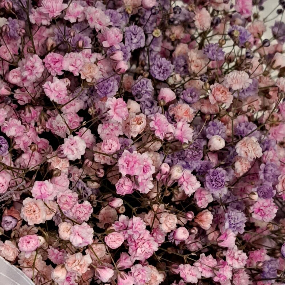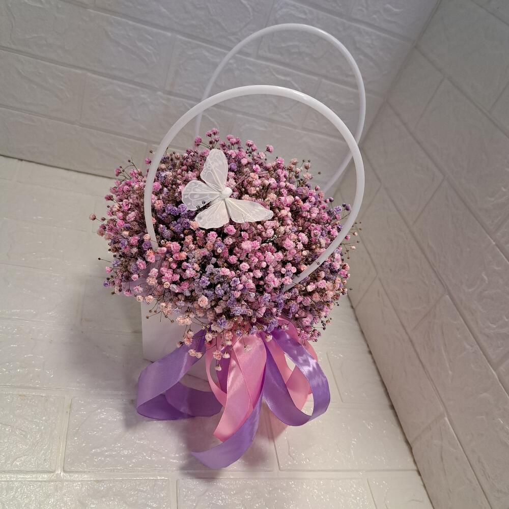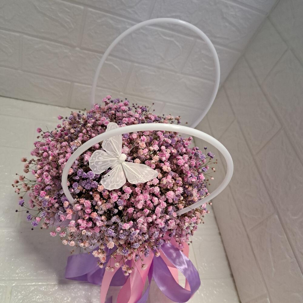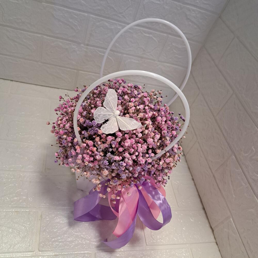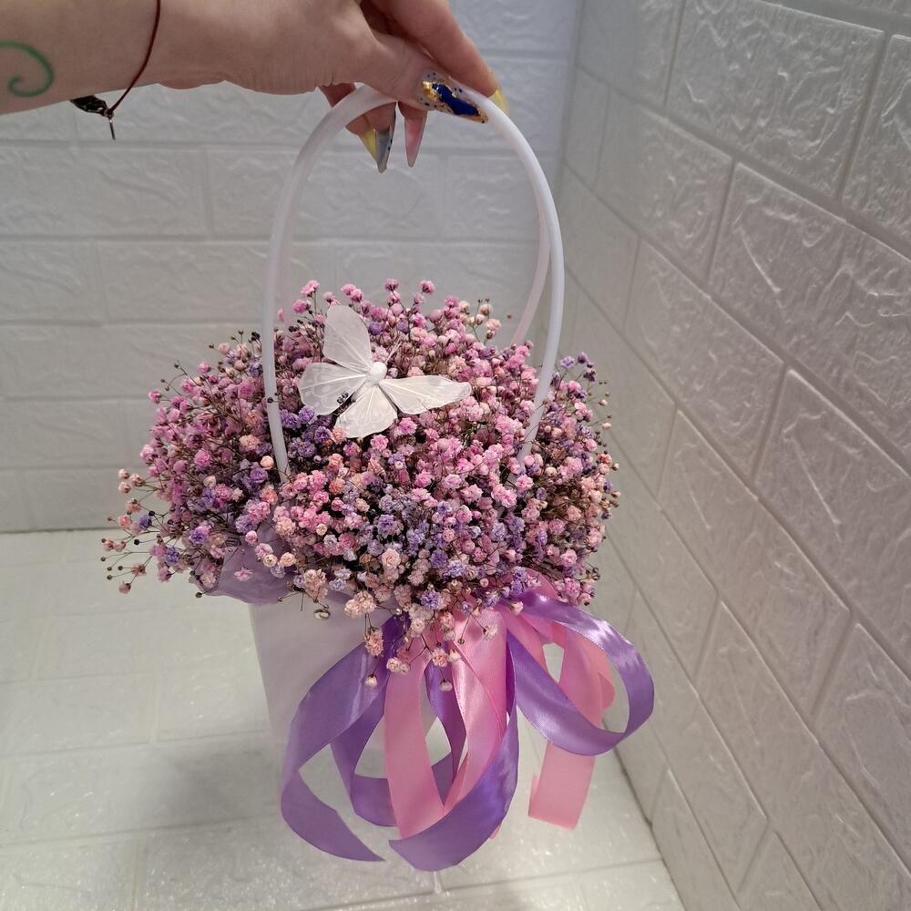 Лента атласная – 2 шт. Бабочка декоративная – 1 шт. Оазис флористический – 1 шт. Сумочка картонная – 1 шт. гипсофила радужная – 5 шт.