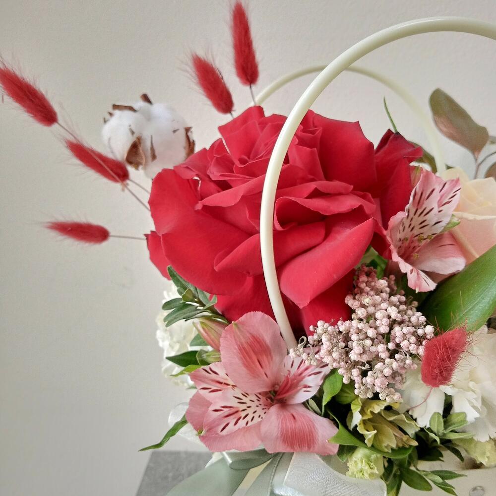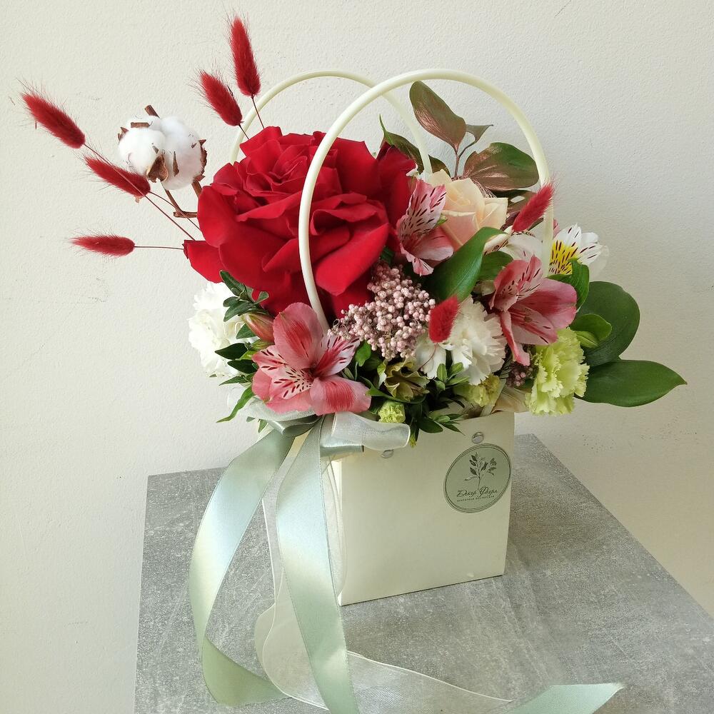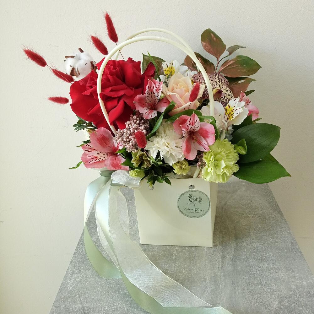 Альстромерия - 2 шт. Озотамнус - 1 шт. Хлопок - 3 шт. Диантус - 4 шт. Роза Талея - 1 шт. Оазис - 1 шт. Самшит - 1 шт. Ванда орхидея - 1 шт. Лагурус (сухоцвет) - 5 шт. сумка крафт с ручками - 1 шт. софи лорен роза - 1 шт.