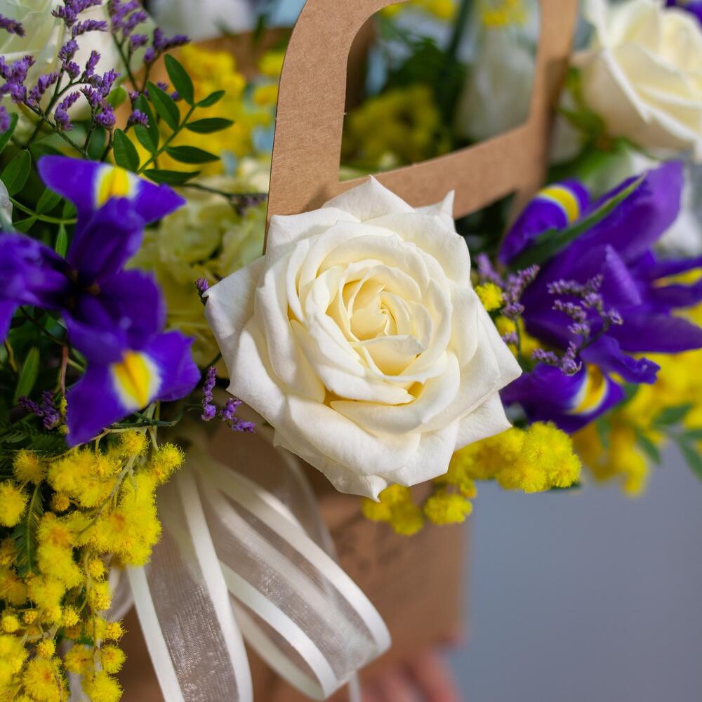 Ирис - 4 шт. Лимониум - 2 шт. Нарцисс - 2 шт. Роза - 5 шт. Эустома - 1 шт. Лента атласная - 1 шт. Фисташка - 1 шт.