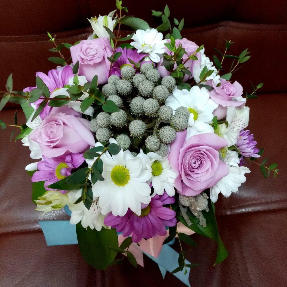 СОСТАВ:Роза – 5 штХризантема кустовая – 2 шт.Альстромерия – 1 шт.Бруния – 2 шт.Эвкалипт – 2 шт.Рускус – 2 шт.Коробка шляпная – 1 шт.Атласная лента – 2 шт.