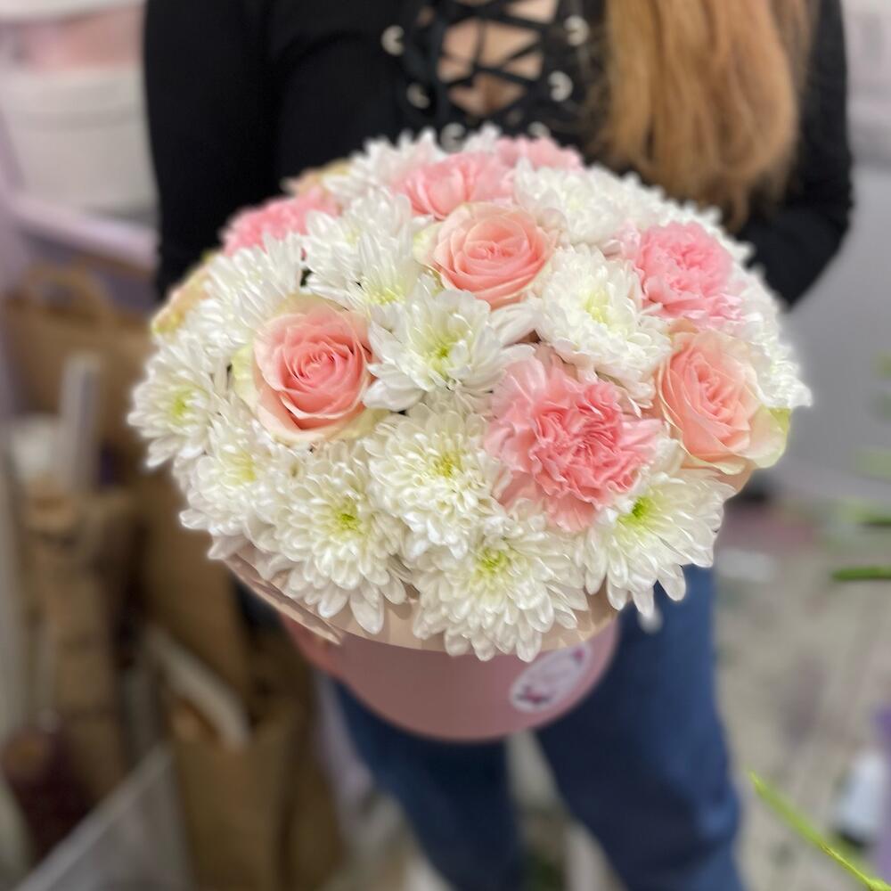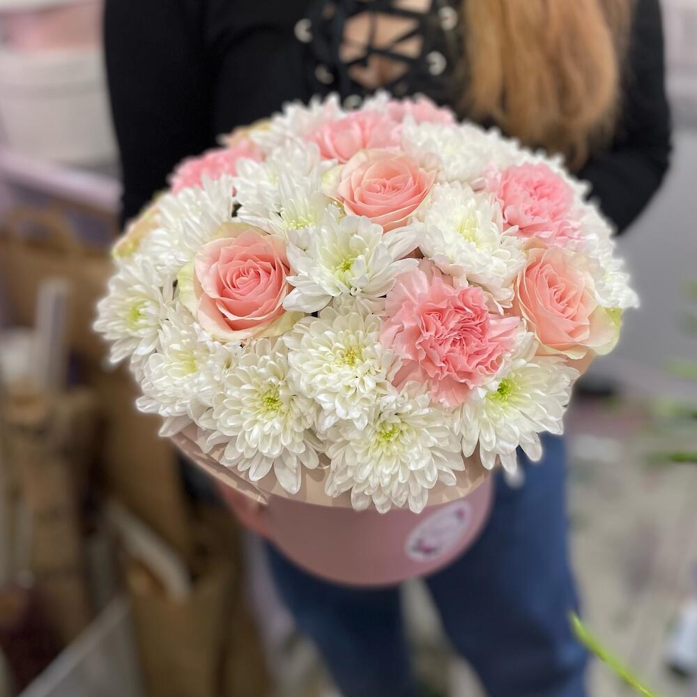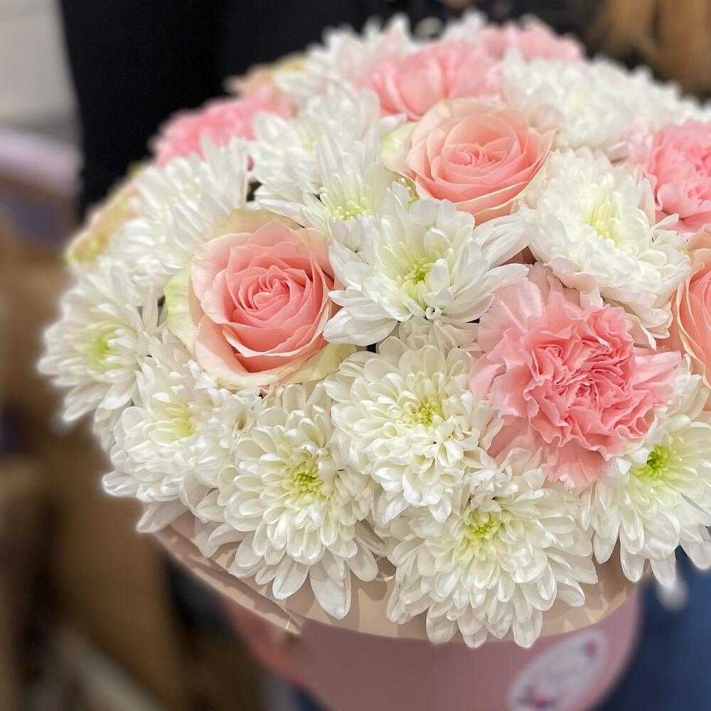 Хризантема кустовая - 6 шт. Роза Эквадор - 5 шт. Диантус - 5 шт. Шляпная коробка - 1 шт.